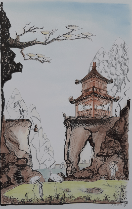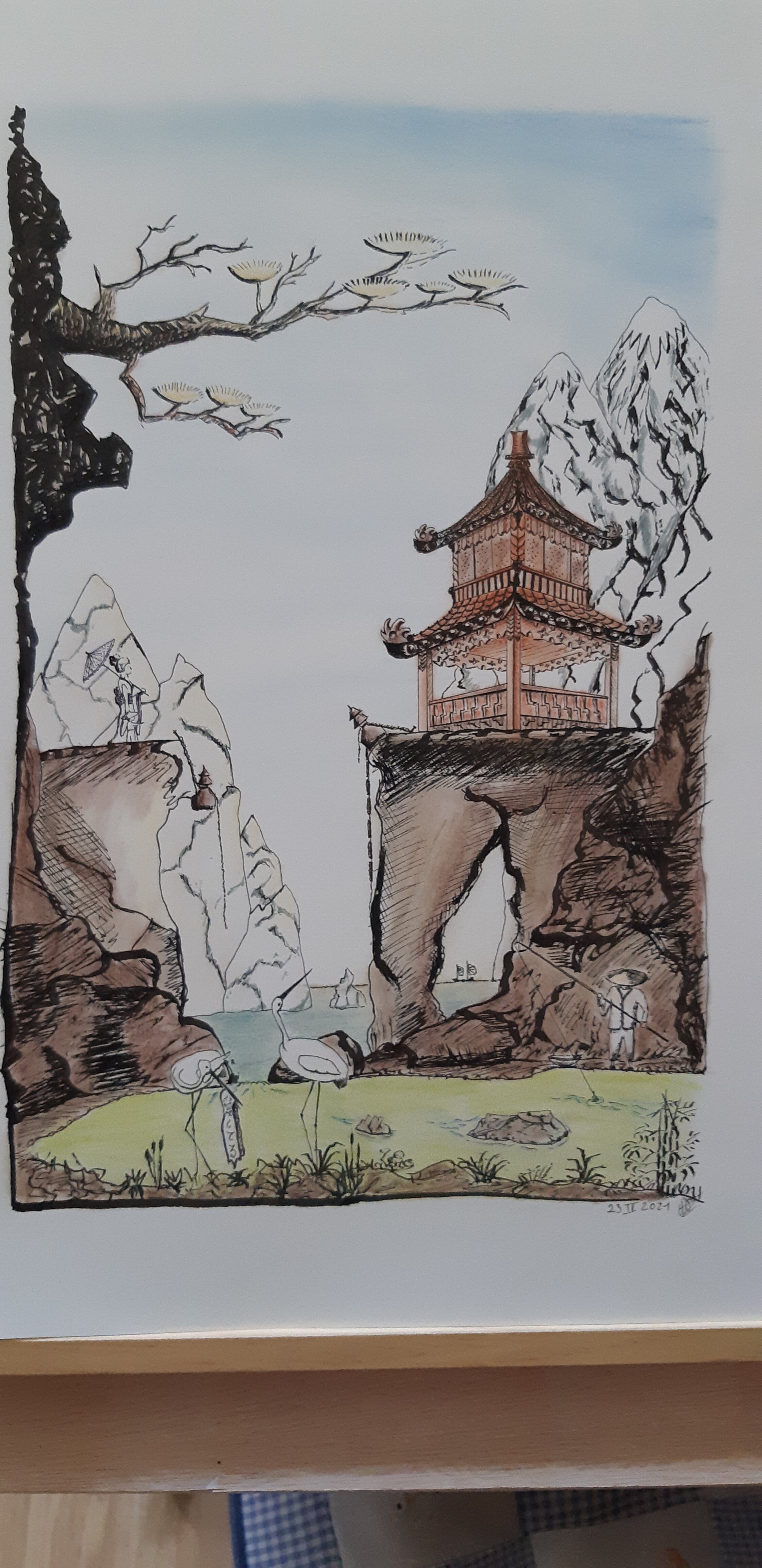 Die Aussicht auf den Tempel funktioniert gut, es gibt viele hübsche Details. Ich mag auch die Verarbeitung des Bildes als Ganzes mit den verschiedenen Dicken von Tintenlinien. Boote, die sich in der Klippe neu befinden, funktioniert auch sehr gut. Die Vordergrundvegetation ist sehr erfolgreich. Meine Sicht täuscht mich oder der Kran hält ein Pergament "Ich liebe dich"? Hihi, es ist Kohl!