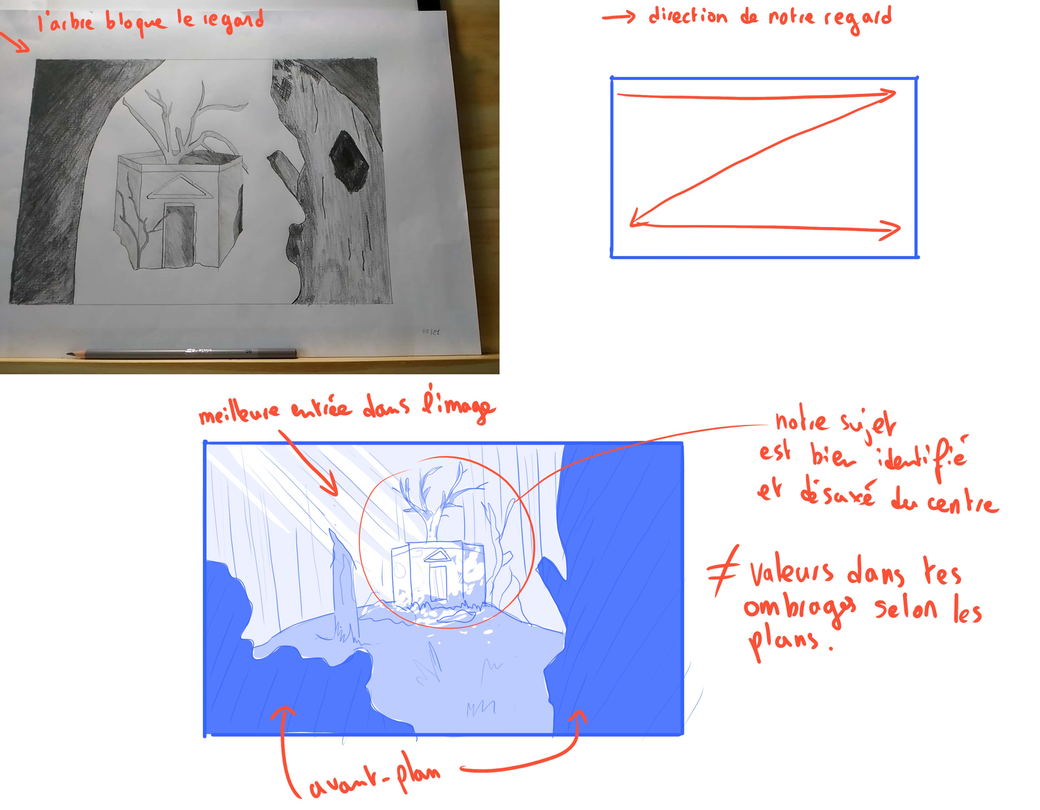 Je t'ai fait 2 propositions de compo légèrement différentes qui normalement accentuent un peu la profondeur par rapport à ton dessin :)
