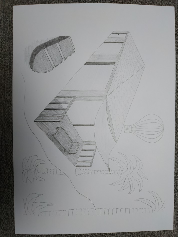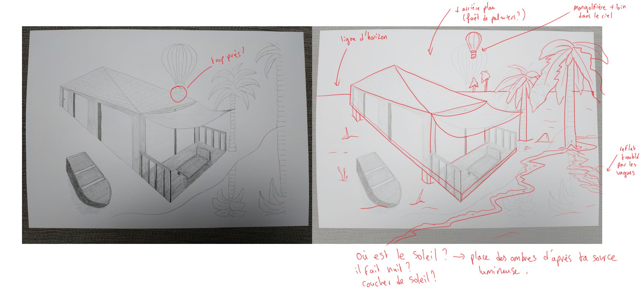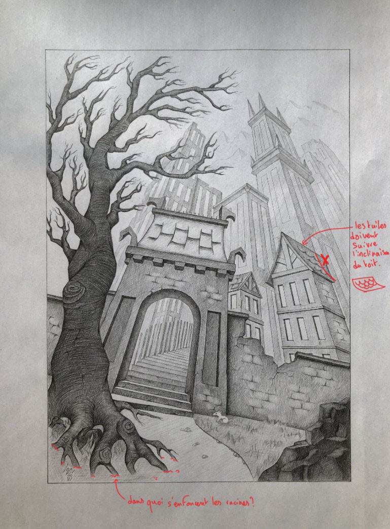 J'ai vraiment aimé faire cet exercice, tout concevoir à partir de pochades jusqu'au résultat final. J'ai mis à peu près 6h de réalisation au total et j'ai essayé d'utiliser toutes les leçons apprises jusque là (perspective, volume, ombrages etc.).