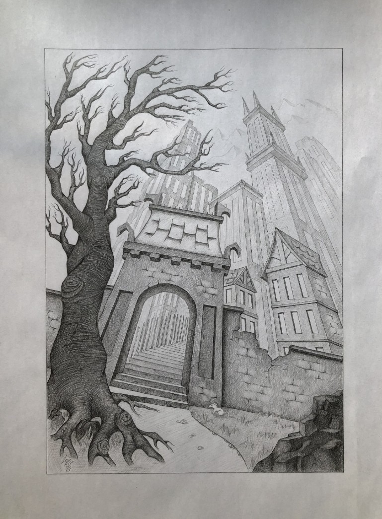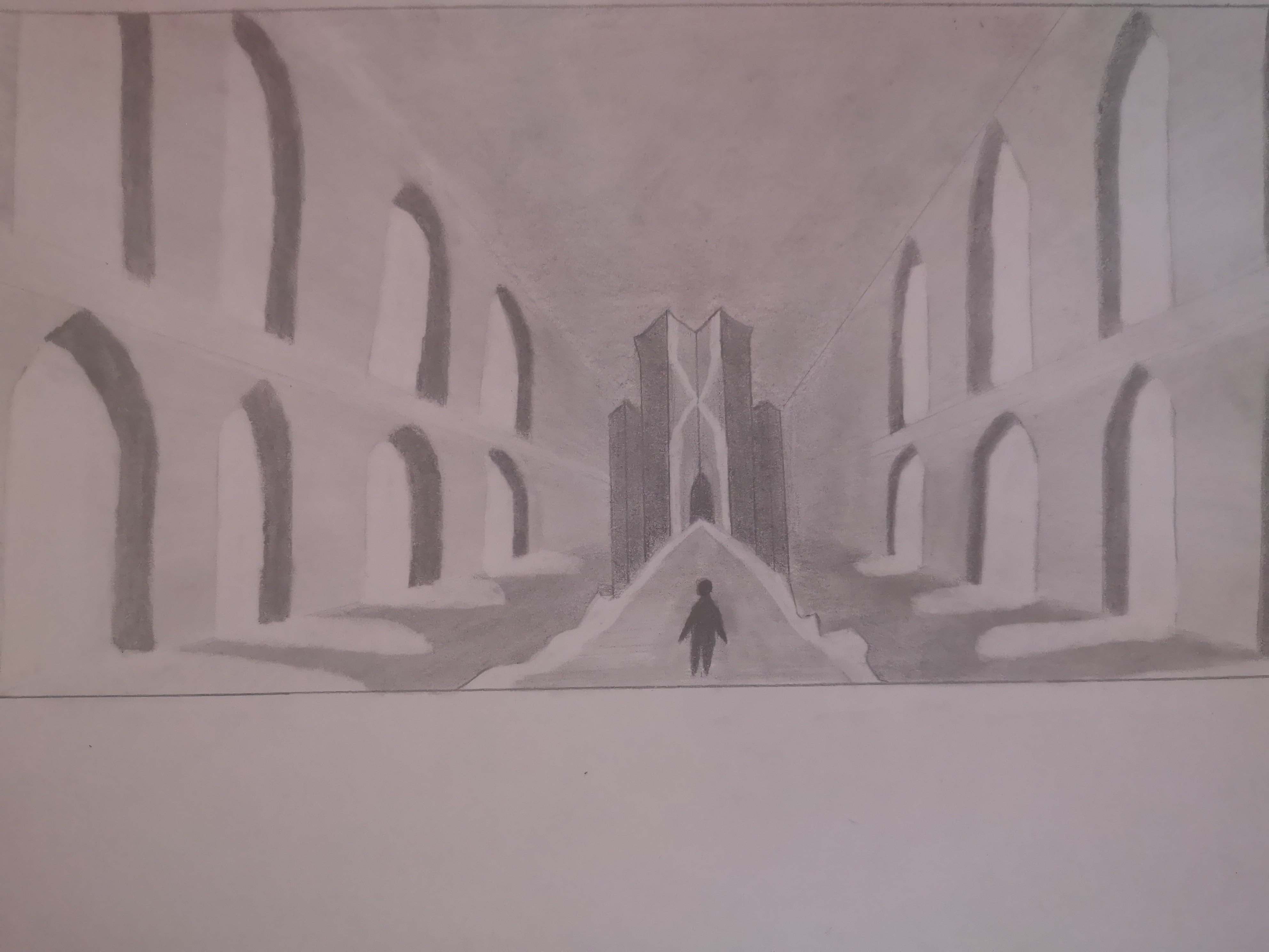 Um Ihrer Zeichnung ein wenig Tiefe zu verleihen, hätte ich versucht, eine Helligkeit aus der Tür und der Ausgabe zu erzeugen, sie stärkt den Tunneleffekt.