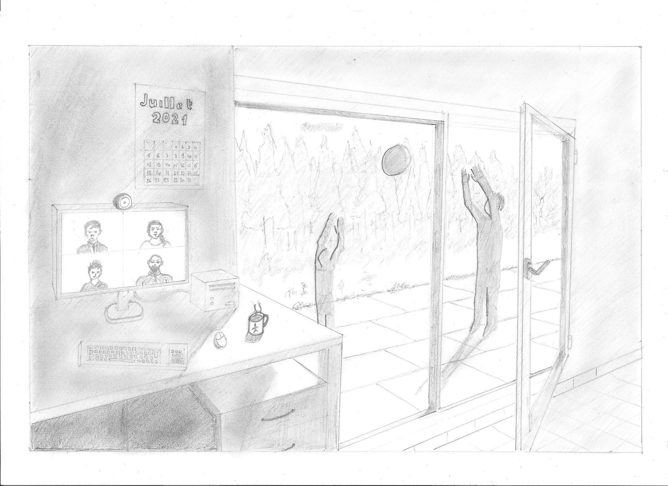 Voici mon dessin. Comme je suis en A4, c'est plus compliqué d'être fin sur certains éléments (mains des joueurs, tête des conférenciers...).