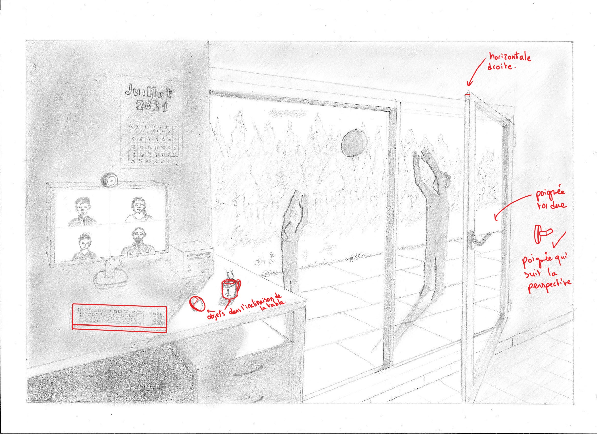 Question subsidiaire : Je me suis demandé comment faire un mur à 90° dont un pan serait aligné à la ligne d'horizon (mais du coup proche toute même) ? J'ai un problème sur le point de fuite pour le mur perpendiculaire. Si vous pouviez m'aiguiller.