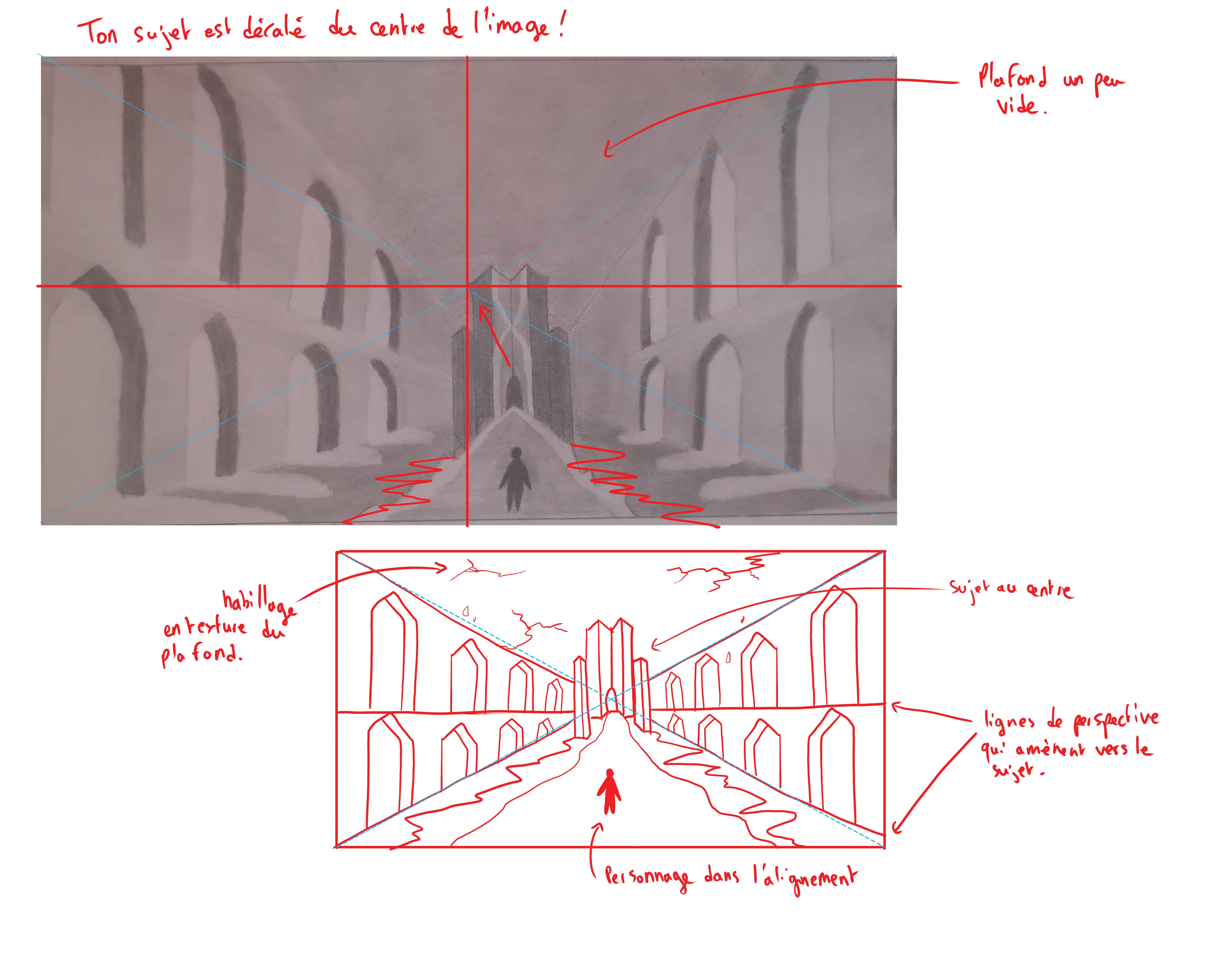 Tu as une bonne structure de départ, ta perspective est juste, maintenant ton arrière plan est assez vide, sans ombrages ni contraste. Habille plus ton décor pour que ton dessin paraisse un peu plus 'fini" :)