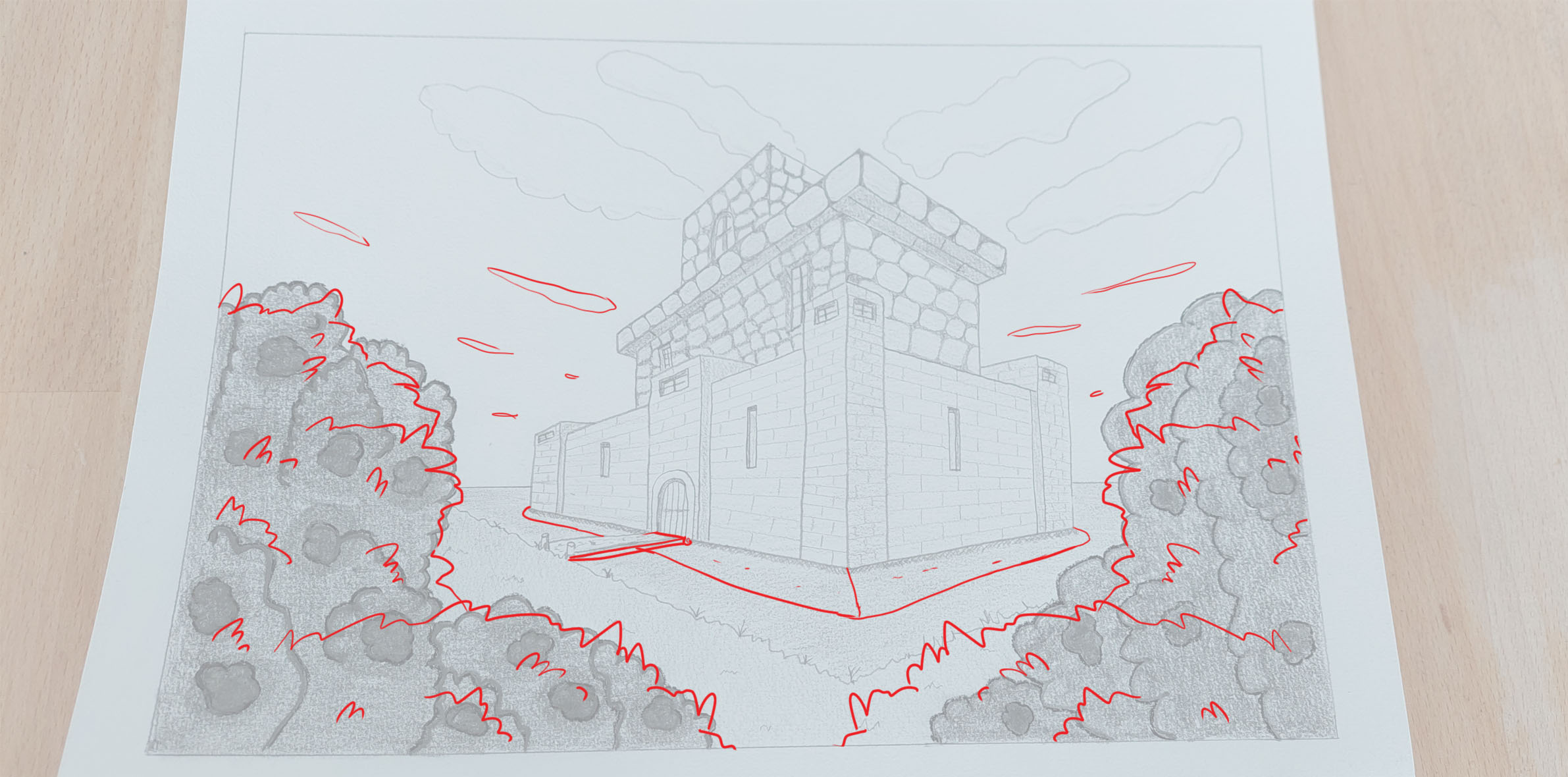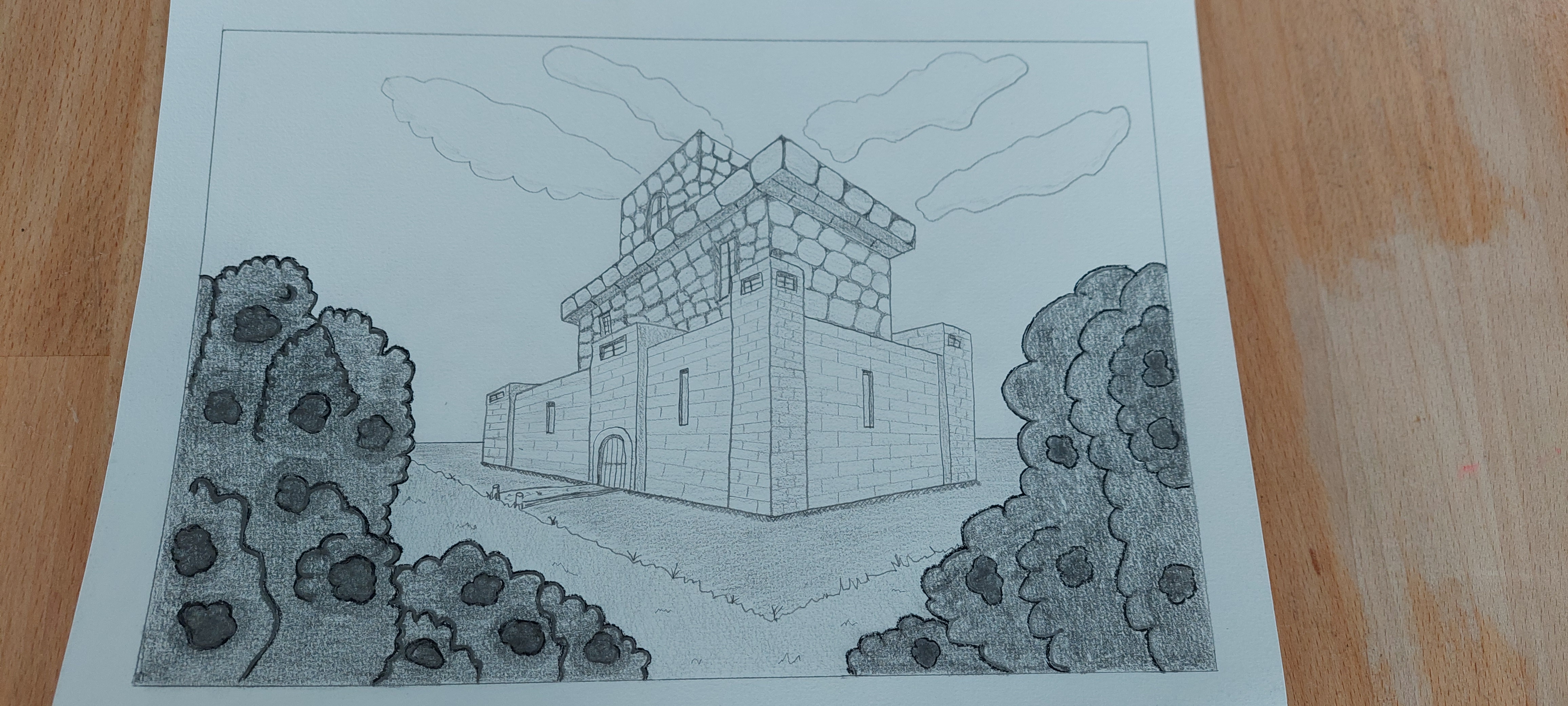 J'aurais cependant utilisé un outil moins gras pour tes ombrages. Là, ça fait un peu "sali" et tu n'as pas d'ombrages sur ton élément principal (le bâtiment)