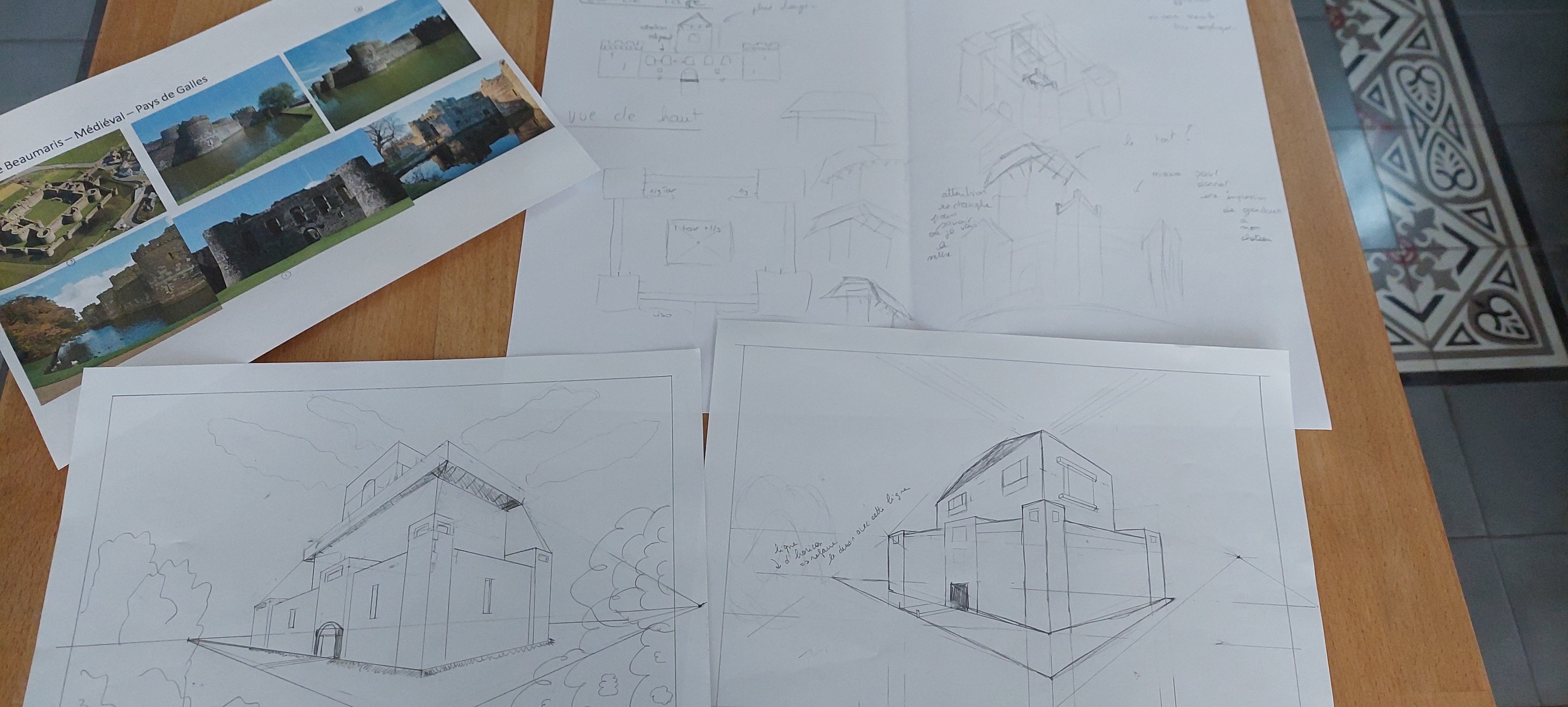 platziert.Merci Marion pour tes commentaires. J'ai bien sûr placé la ligne d'horizon et les points de fuites pour construire mes bâtiments