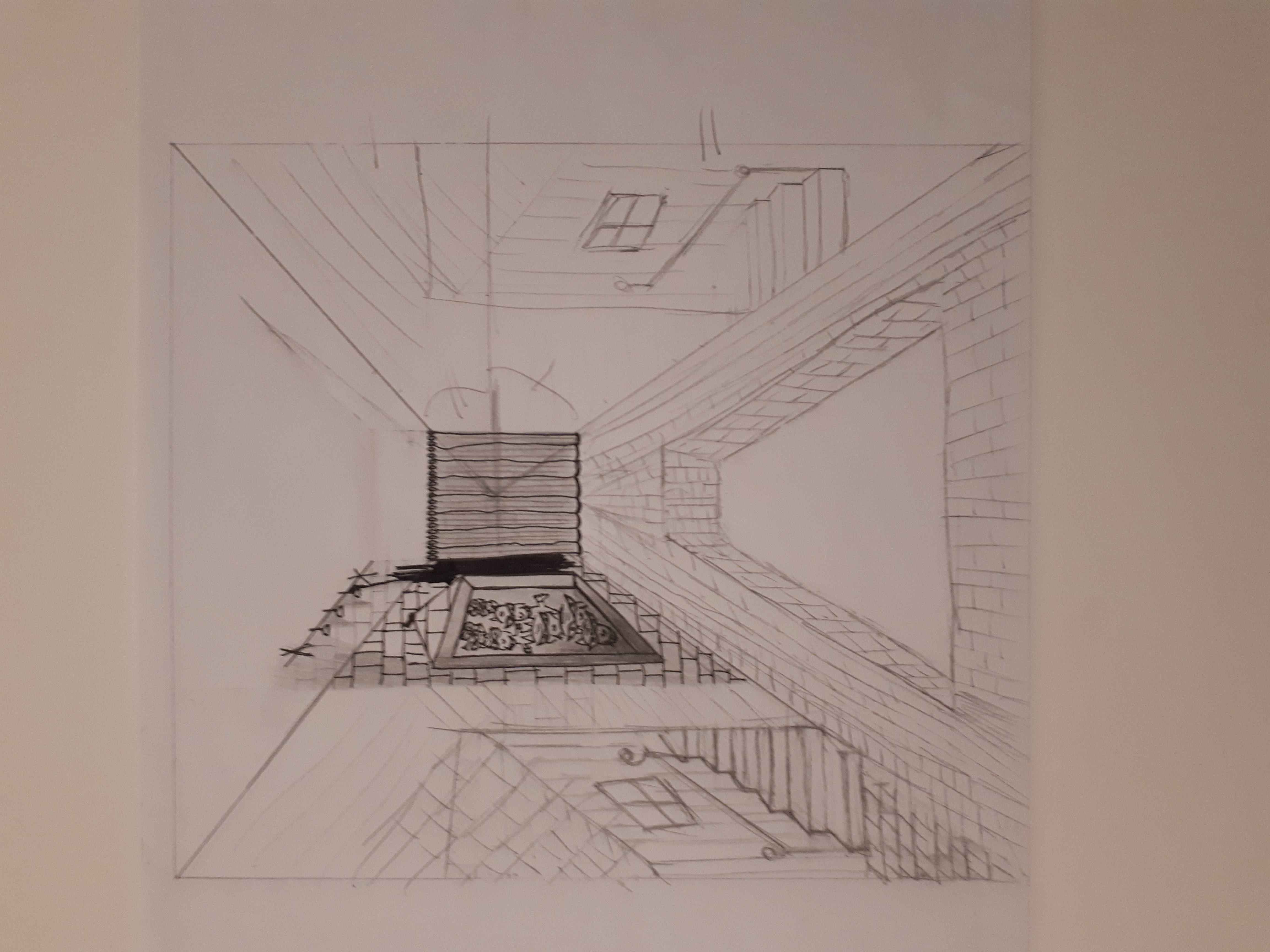 Hier ist meine saubere Zeichnung. Ich bin mit allem nicht zufrieden, aber ich fand sehr lehrreich. Ich finde meine großen Wände zu leer, ich würde sicherlich später Punkte wieder aufnehmen. Ich ließ den Gegenangst fallen, das Rendering war seltsam, indem ich Gebäude unter der Horizontlinie hatte und der Standpunkt nicht für mich schien, um den Gegenmuddy