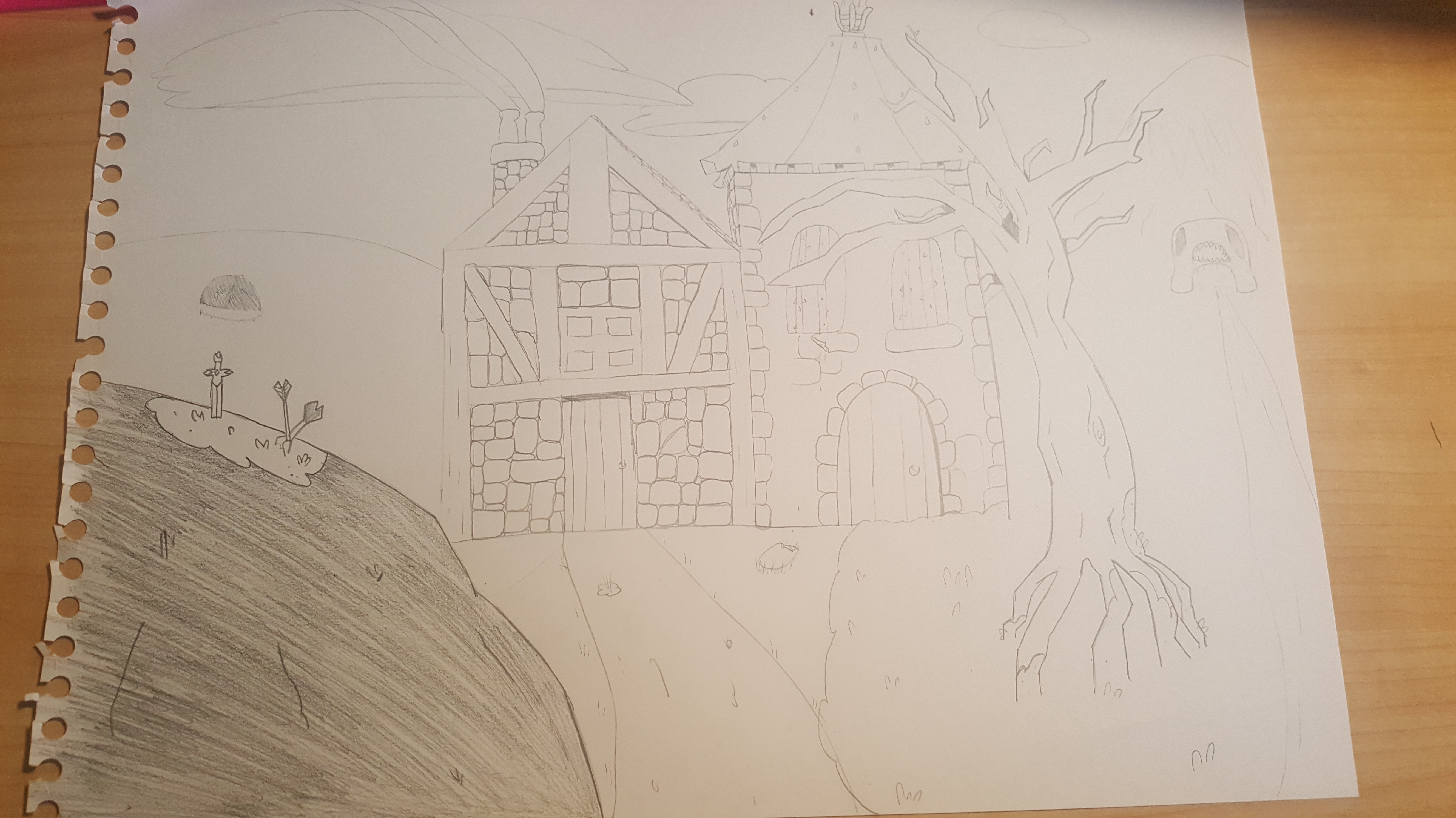 Vraiment j'ai adoré ces 2 dernières vidéos. Partager sa méthode et le cheminement des réflexions pour produire une belle illustration c'est vraiment enrichissant ! Alors déjà merci à vous pour ces cours. J'ai bien aimé travailler sur cet exercice j'ai essayé de prendre mon temps. Je vous partage une vue des travaux lol (j'ai zappé quelques feuilles de la honte lol) et l'illustration finale. J'ai loupé les buissons dommage c'est le premier plan...peut-être auriez vous des conseils pour mieux les réussir.... J'ai hâte d'avoir vos retours. A très vite et encore bravo!