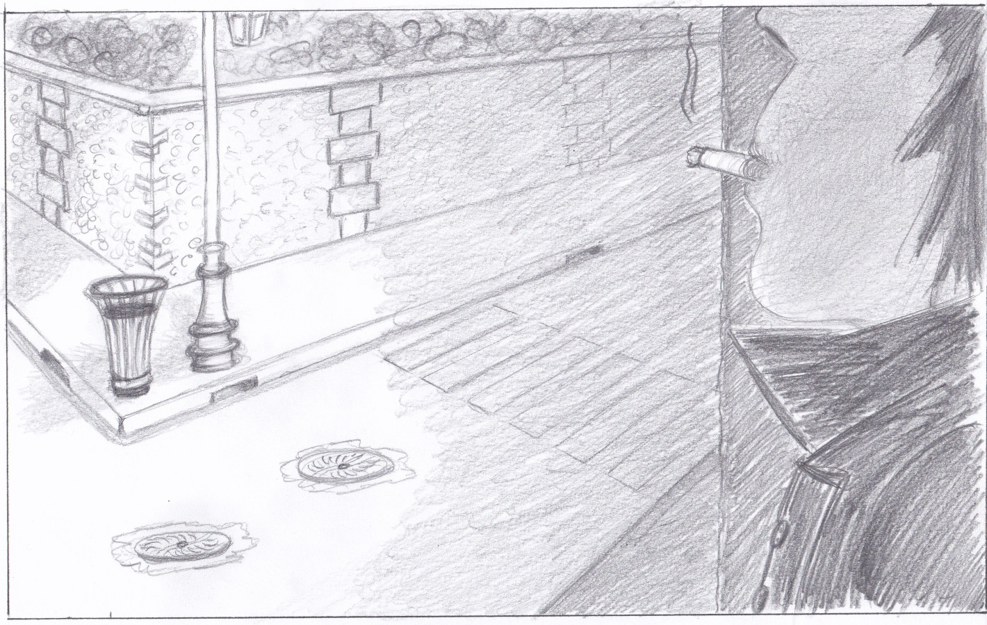 Salut Kocomo, Ton dessin est vraiment bien réussi dans l'ensemble, c'est cool ! :) Tes plaques d'égout devraient être plus "rondes" je pense, pour bien s'encrer dans la perspective de ton sol. Essaies aussi d'être plus doux dans tes coups de crayon, surtout au niveau des ombrages, ça rendra mieux :)