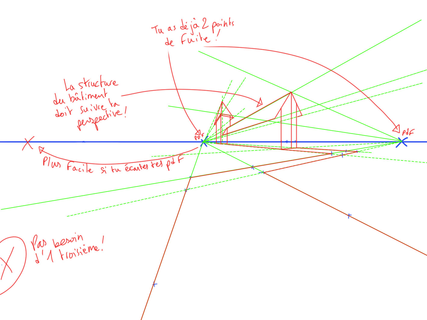 Hallo Jairem, Ich habe mir eine Weile gebraucht, um zu verstehen, aber Sie brauchen keinen dritten Flugpunkt für Ihren Weg! Schauen Sie sich meine gezeichnete Korrektur an, ich habe Ihr Gebäude auf grundlegende Weise nachgebaut und die beiden Flugpunkte beibehalten, die Sie an Ihrer Zeichnung angelegt hatten. (Es ist einfacher, wenn PDFs weit weg voneinander entfernt sind) Sie verfolgen zuerst Ihre Horizontlinie, Sie platzieren Ihre Flugpunkte und platzieren Ihre Elemente in der Perspektive Ihres Bildes. Wenn Sie einen dritten Flugpunkt einsetzen, werden Ihre Elemente auch zu ihm "fliehen". Ich hoffe, es wird für Sie klar sein! :)