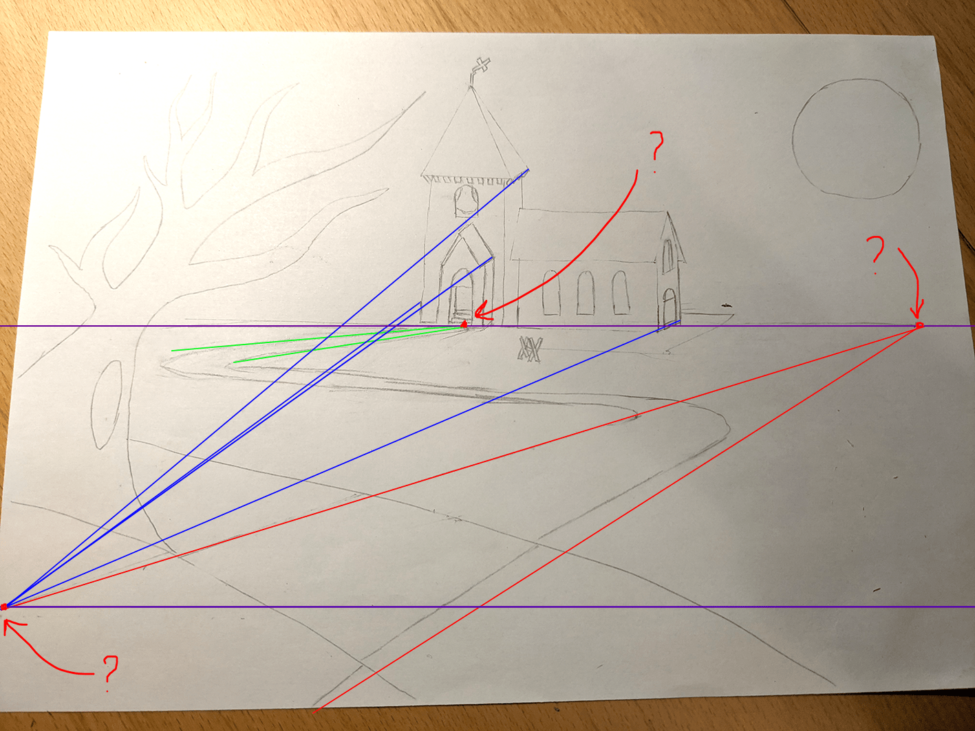 Par contre, j'ai toujours un soucis pour les perspective. Voici un brouillon : J'aimerais tracer un chemin qui va vers une église, et je trouve plusieurs points de fuite. Les lignes rouge représentent un premier chemin allant vers le point de fuite, j'ai le sentiment que second chemin le plus à gauche, en vert, est mal tracé...