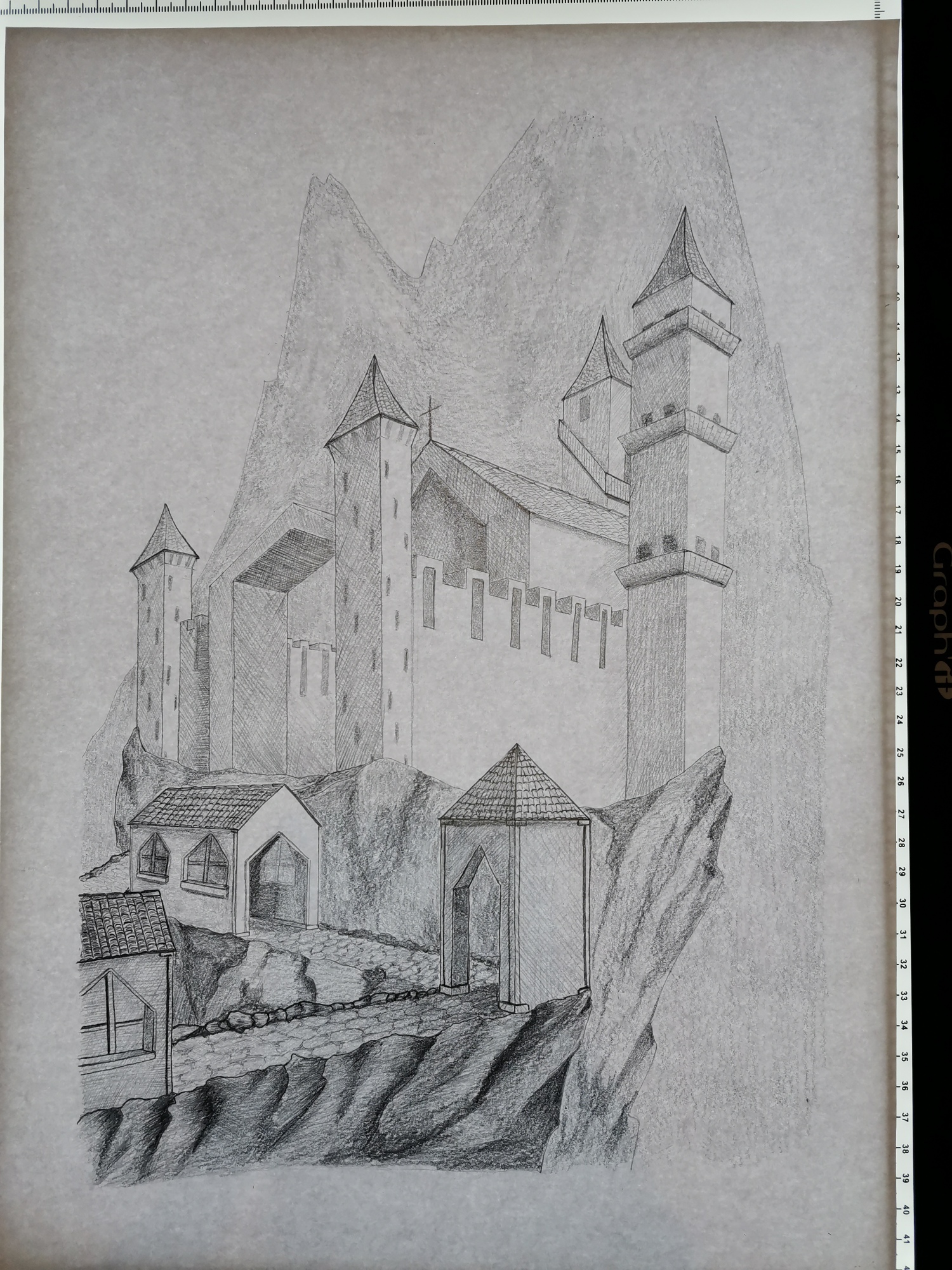 zu rechtfertigenVoila mon dessin au propre. Je ne suis pas contente de tout, mais j'ai trouvé très instuctif. Je trouve mes grands murs trop vide, je reprendrais sûrement cerains points plus tard. J'ai laissé tomber la contre-plongée, le rendu était étrange en ayant des bâtiments en dessous de la ligne d'horizon et le point de vue ne me semblait pas justifier la contre-plongée