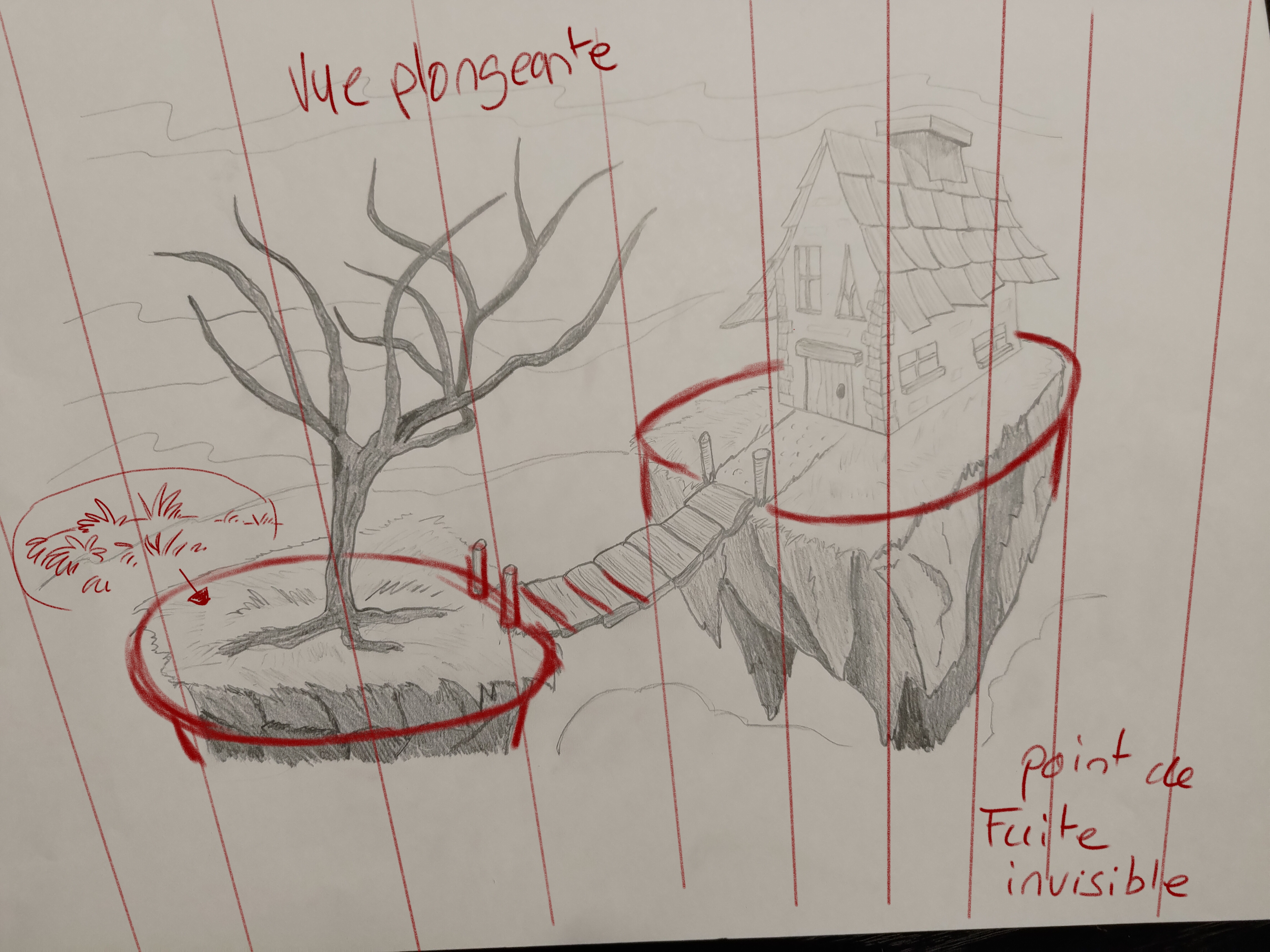 Bonjour Karen72, Tout dépend de quel point de fuite tu pars. Dans cette vue plongeante, le point de fuite qui donne cette sensation de hauteur et de profondeur et bien en dessous de ta feuille. :)