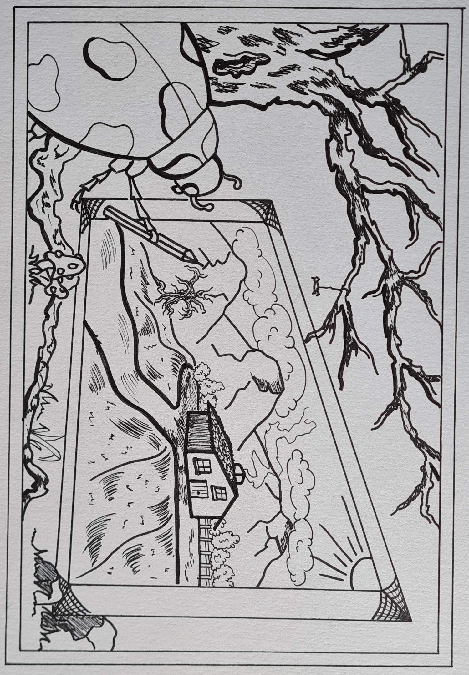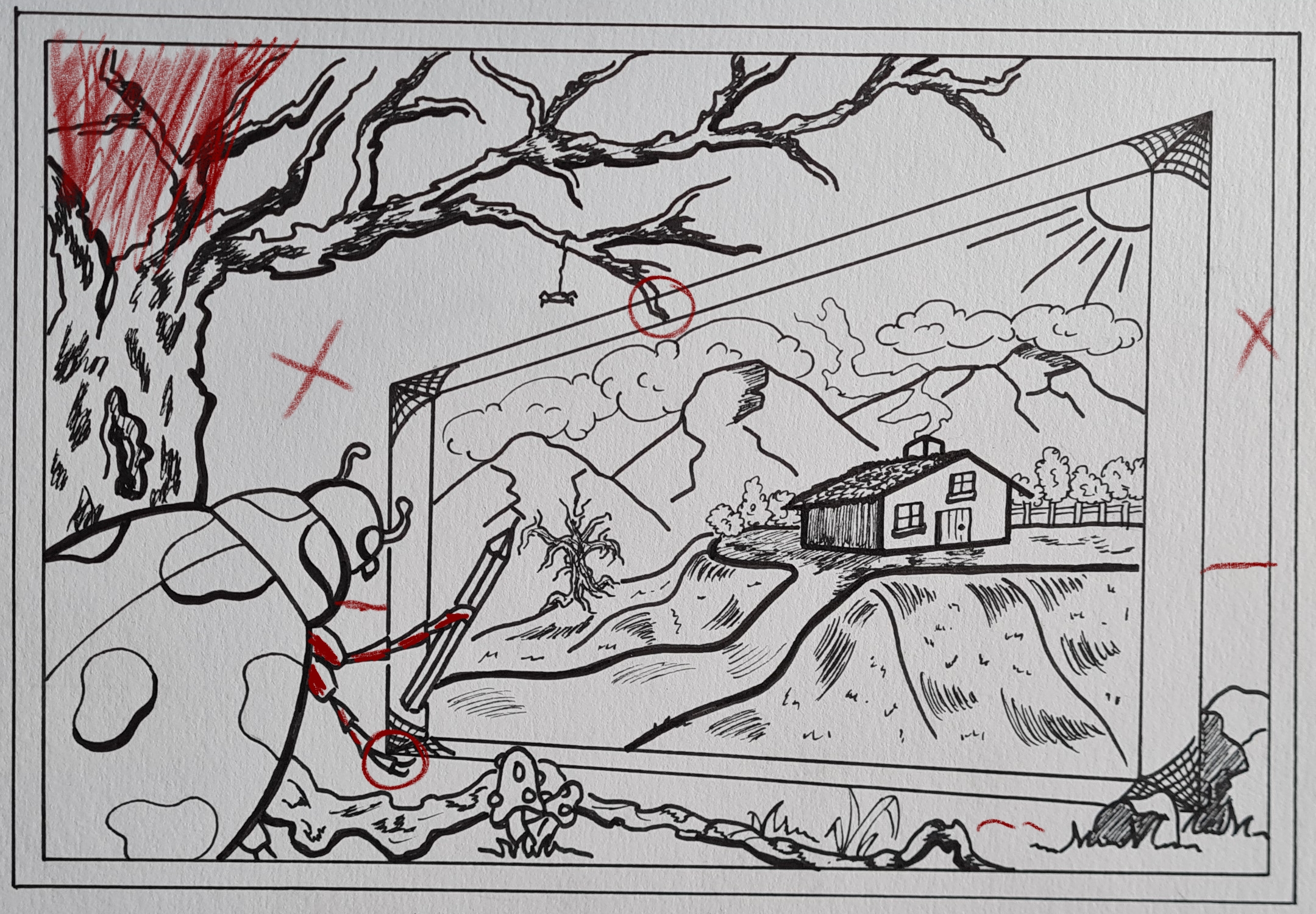 Seitenkomposition, ich werde nur sagen, dass der Baum nach oben verlängert werden kann, um den Raum in der linken Ecke zu füllen. Es gibt zwei Knoten in Ihrer Zeichnung, die ich umgeben habe: Für den Zweig denke ich, dass Sie es hinter dem Gemälde passieren können, und für die Pfote des Marienkäfers wäre es nur notwendig, es zu bewegen, um zu verhindern, dass es an der Ecke des Tisches klebt.