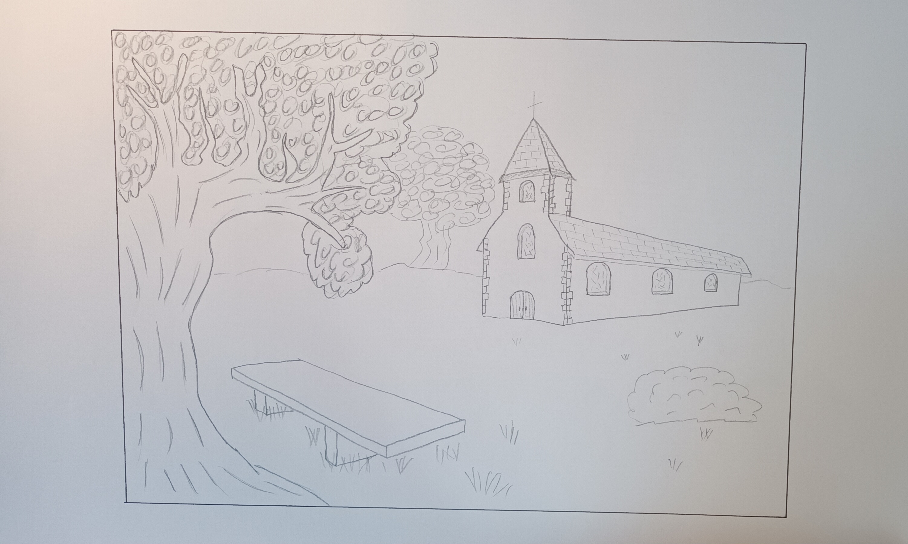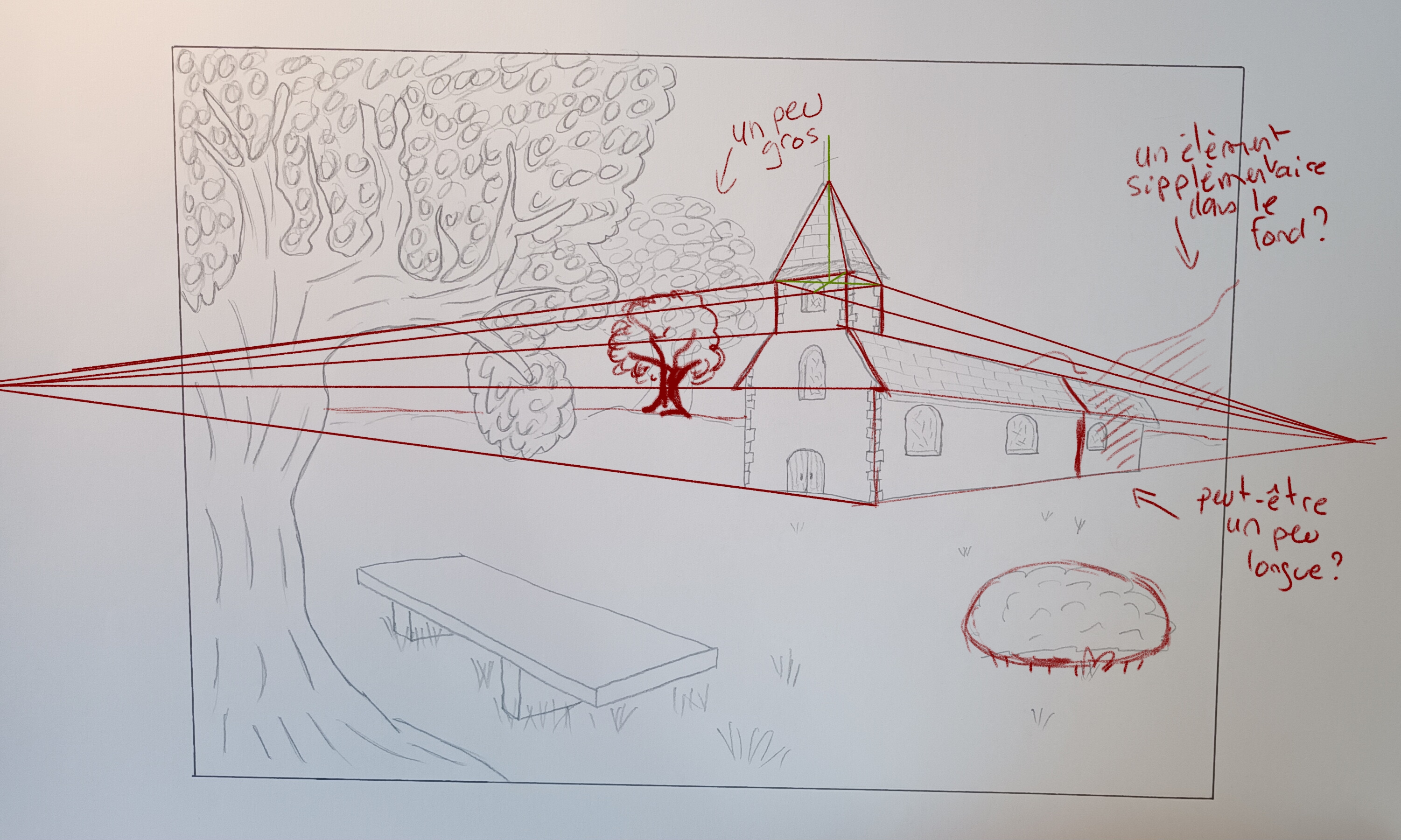 Côté proportion, l'arbre du fond est clairement trop gros, tu peux le faire beaucoup plus petit. Et ton église me paraît fort allongée... Je pense qu'elle pourrait tout à fait être raccourcie.
