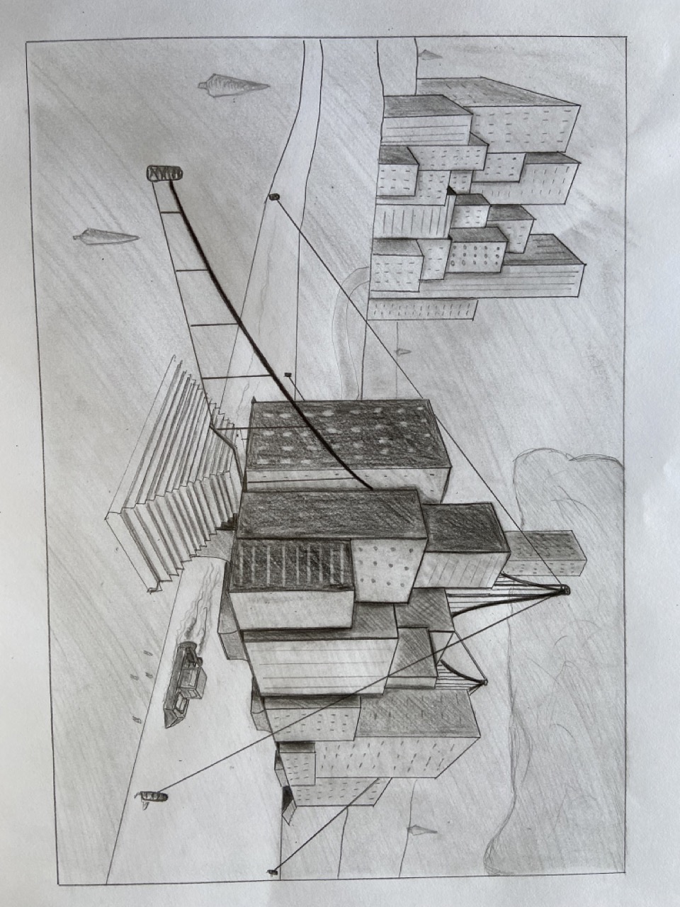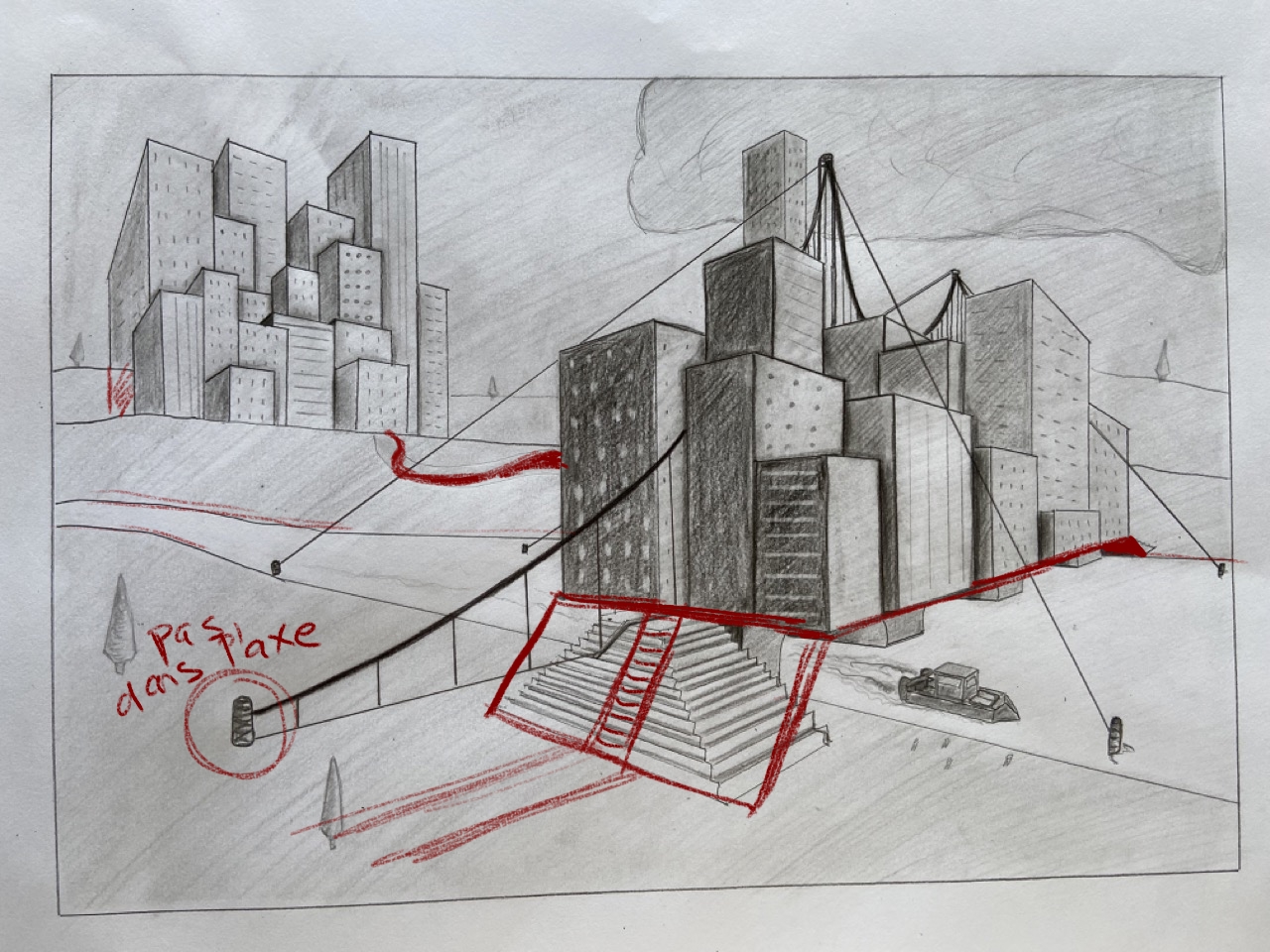 Salut Dalair, content de voir que l'exercice te plaise autant! Et je vois que tu as mis encore une fois la barre assez haute niveau complexité architecturale! Beau travail dans ta composition. Ta perspective est plus correcte que sur ton essai précédent, c'est cool. Je noterai juste des petits soucis de logique: l'immeuble de l'arrière plan qui ne devrait pas être coupé par la ligne du fond, l'axe et la taille de la route au loin, et surtout ce pont-ville du premier plan dont je ne suis pas sûr qu'en l'état il pourrait tenir! En lui donnant une base plus large et plus épaisse ça donnera à cette structure plus de stabilité. Ce qui jure dans cette construction à mon sens, ce sont les câbles de tension, qui en plus de ne pas avoir de véritable utilité ici, posent un vrai problème au niveau de la construction, et sont même hors axe de cette dernière.