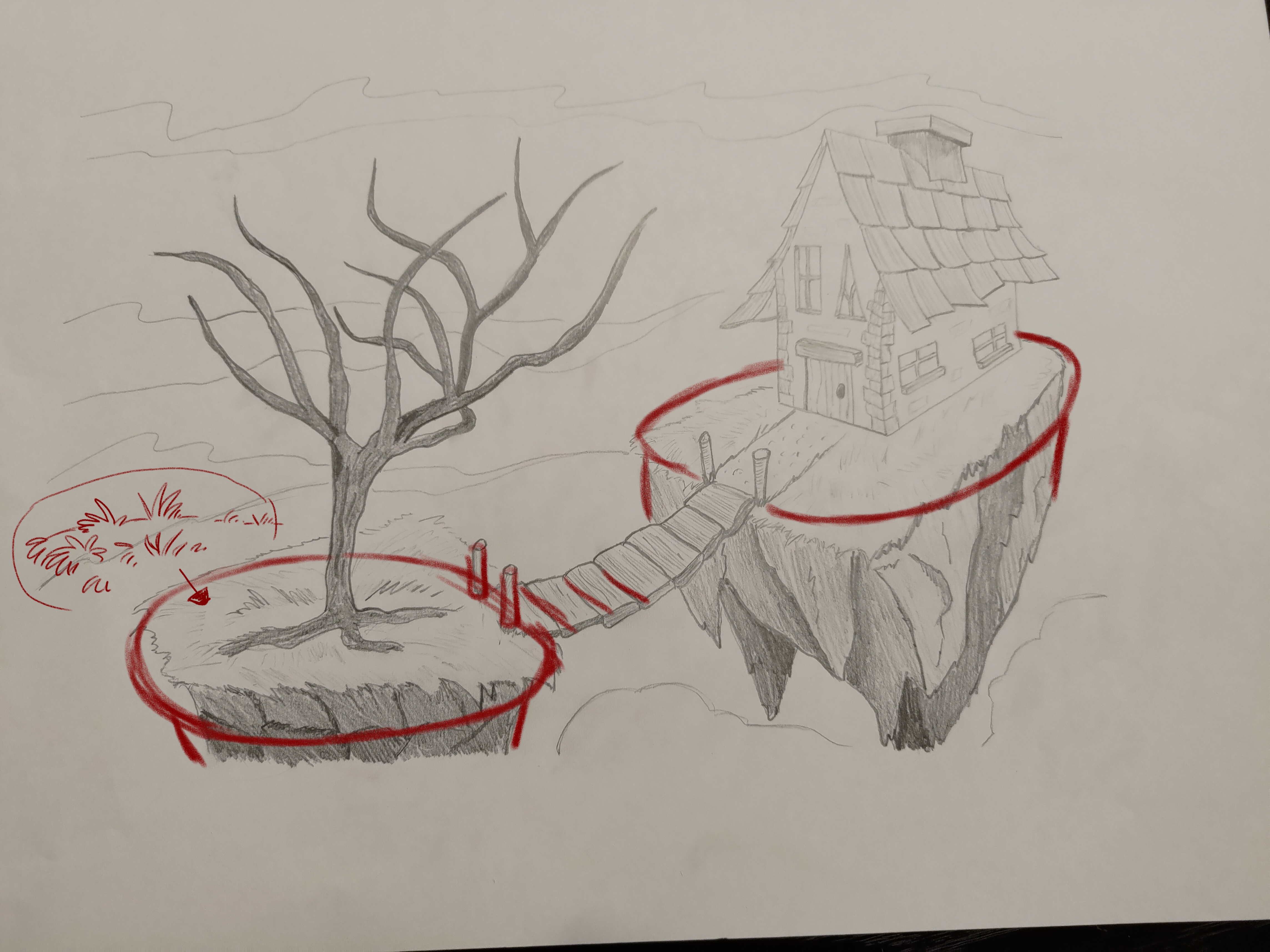 Für die Erdblöcke dachte ich, ich müsste sie von meinem Fluchtpunkt abhängen, deshalb haben sie diese Form. Vielen Dank an den Tipp für das Gras 😀😀😀