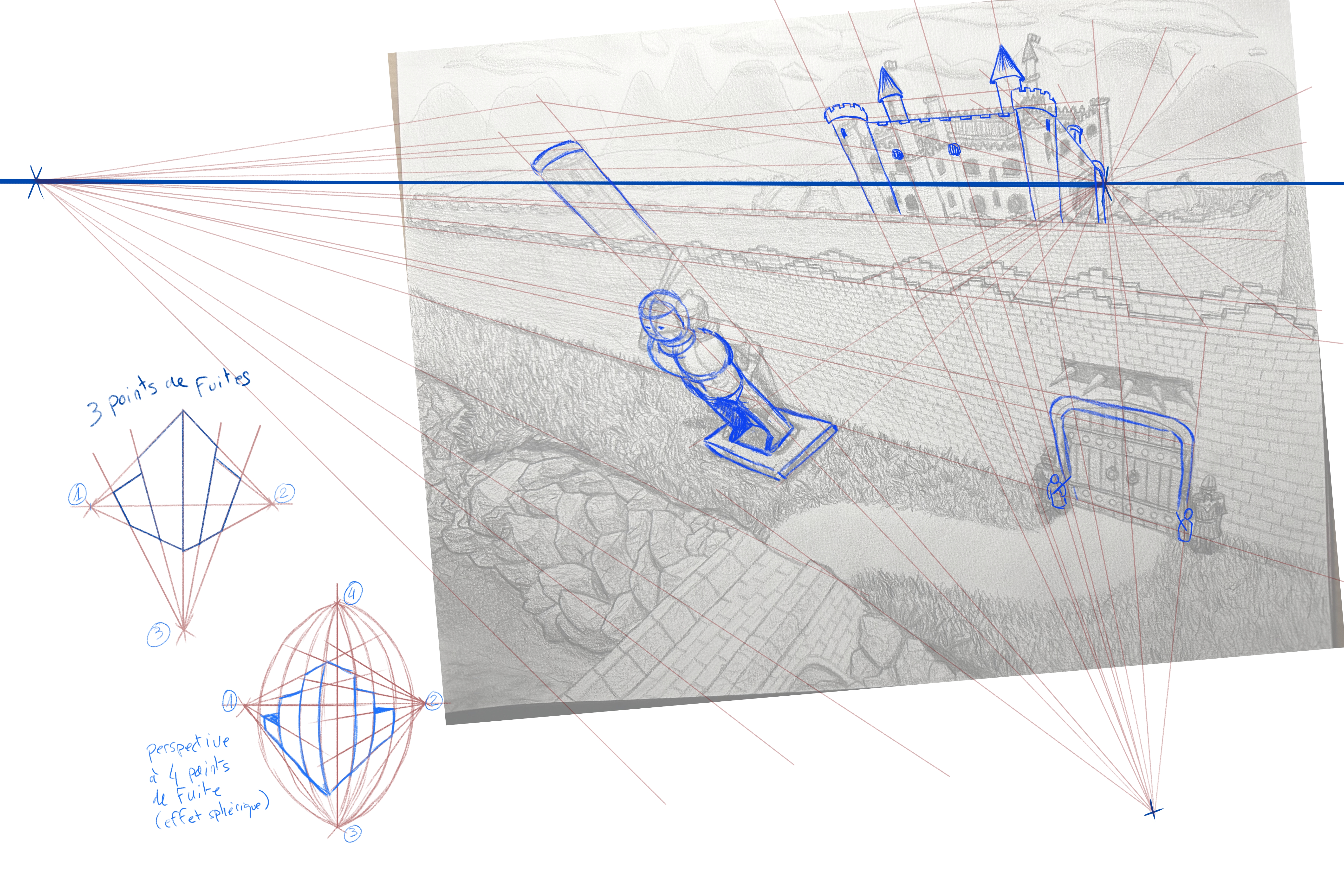 Guten Abend Lepigeonvoyer19, es ist wirklich toll und wieder haben Sie einen ehrgeizigen und komplexen Schuss gewählt! Nun, es gibt immer noch das Hintergrundproblem auf der perspektivischen Seite, die nicht funktioniert ... gut aus einem sehr einfachen Grund - und ich musste es mit Sicherheit schlecht erklären, wenn Sie an dieser Komposition gearbeitet haben, oder es entkam mir - es ist, dass Ihr Schloss im Hintergrund mit dieser Tauchansicht nicht über die Horizon -Linie weitergegeben wird. Andernfalls ist es keine Ansicht beim Tauchen mehr ... Bei meiner Korrektur können Sie feststellen, dass der Winkel die Elemente wirklich verformt, indem Sie den gesamten Fluchtpunkt zurückverfolgen und das Schloss wiederholen. Auf meiner kleinen Skizze an der Seite können Sie als 3 -Punkte -Perspektive eine Ansicht schnell verzerren. Die Lösung kann darin bestehen, an 4 Flugpunkten eine Ansicht zu treffen, mit der Sie die Verformung mit einem sphärischen Effekt "steuern" können. Aber es ist vielleicht nicht der gewünschte Effekt. Eine Perspektive bei 5 Leckagepunkt könnte auch in dieser Komposition interessant sein.
