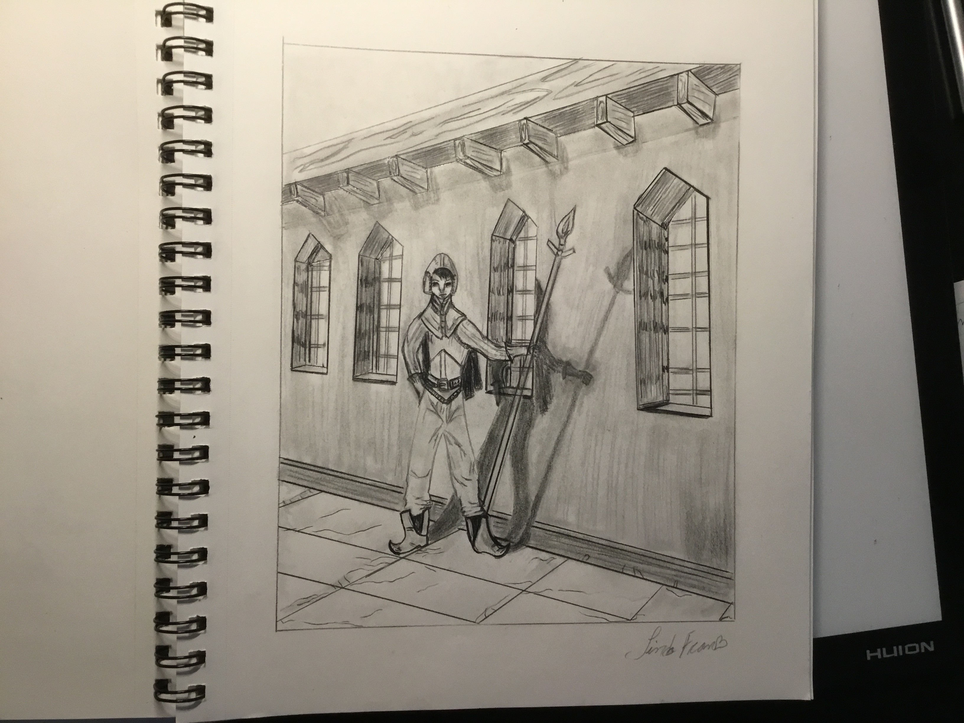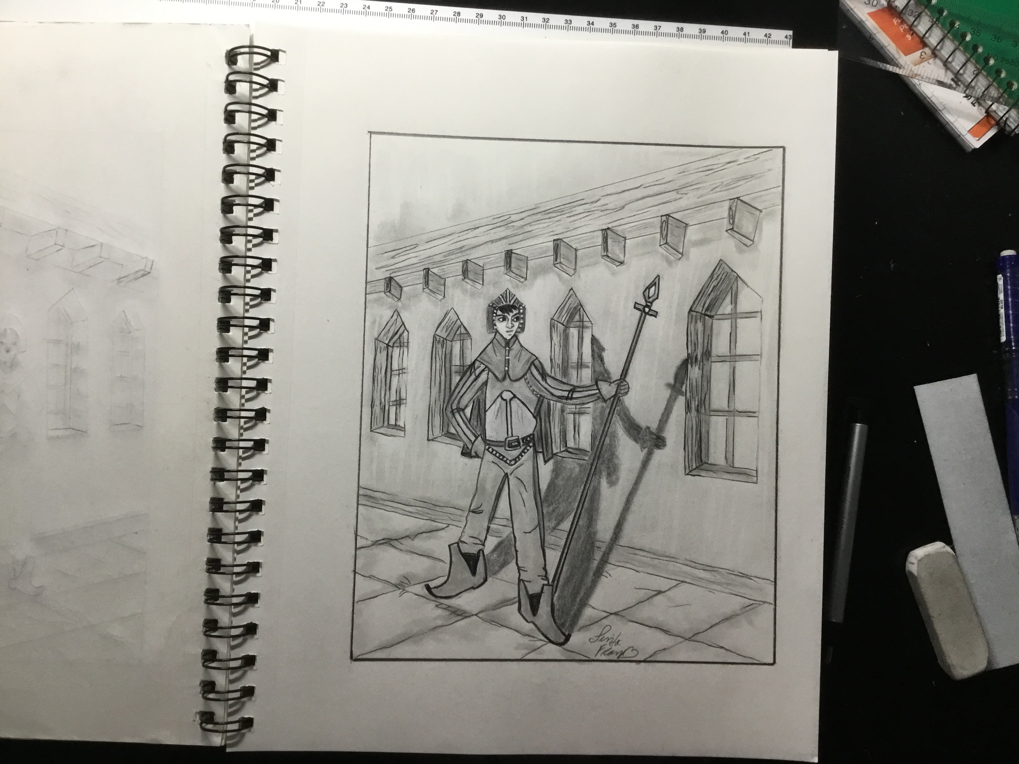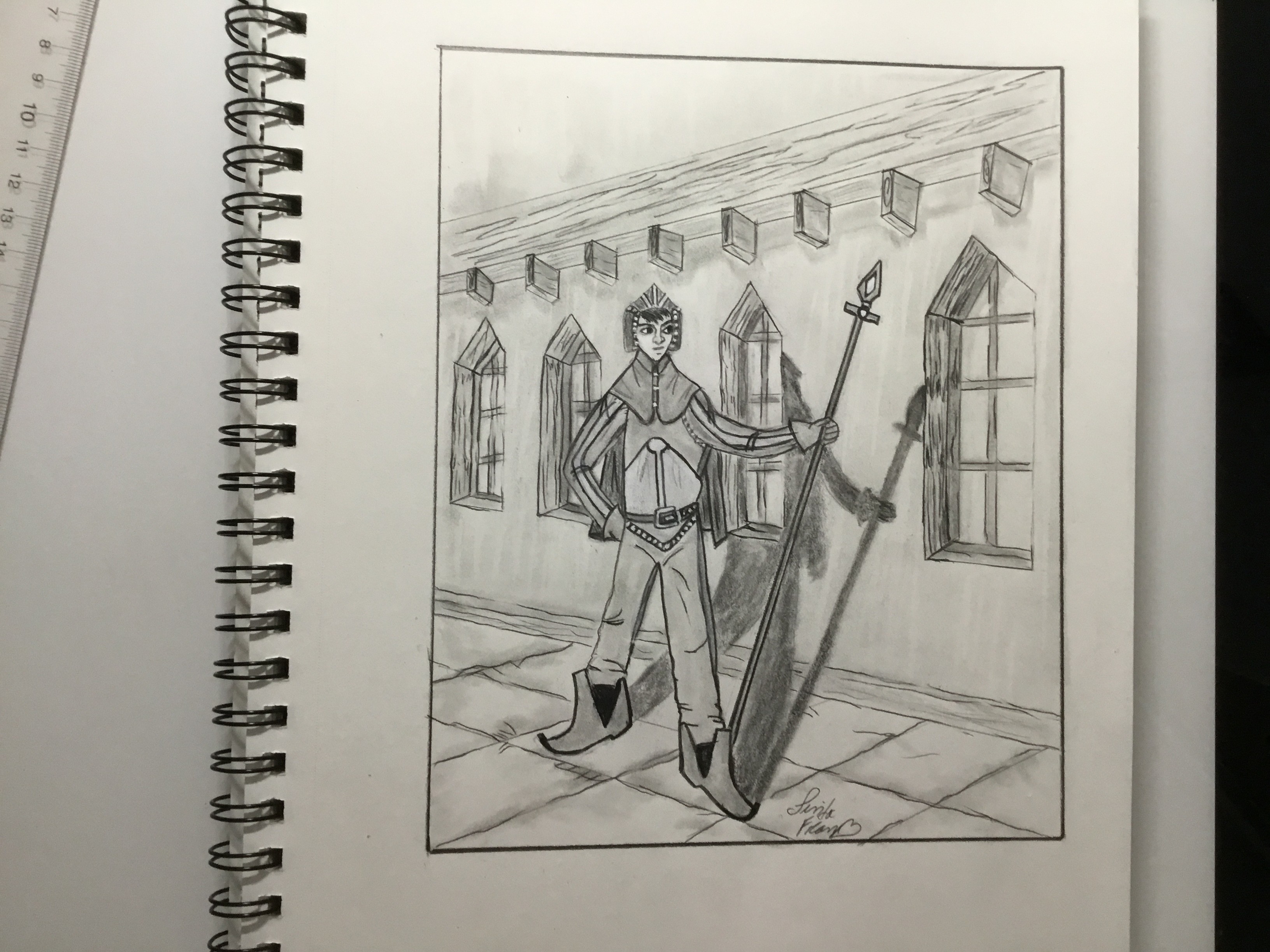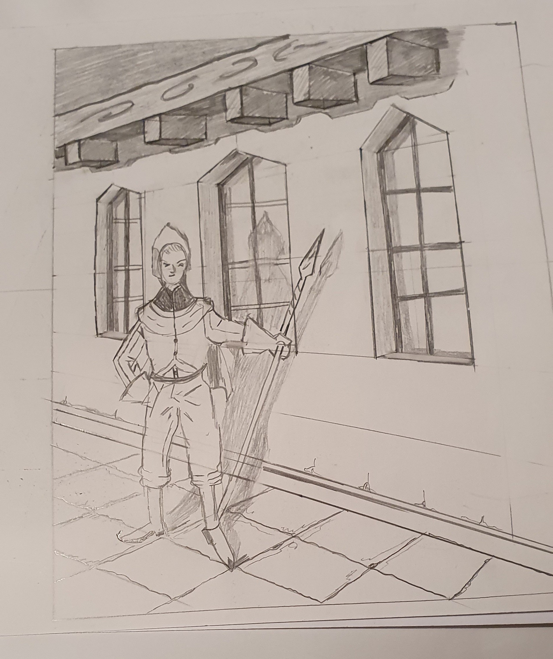 Merci beaucoup pour ce cours très complet et fun qui m'a permis de comprendre plein de choses !! Voici un dessin où j'ai essayé de mettre en pratique les différents aspects de la formation et surtout la perspective où je galère un peu! J'ai un peu raté le visage au dernier moment en rajoutant des traits plus marqués et foncés :( je suis pas encore au claire sur le type de crayons à utiliser...mais pour le reste je suis plutôt contente de ma progression... Tout feed back sera le bienvenu :)