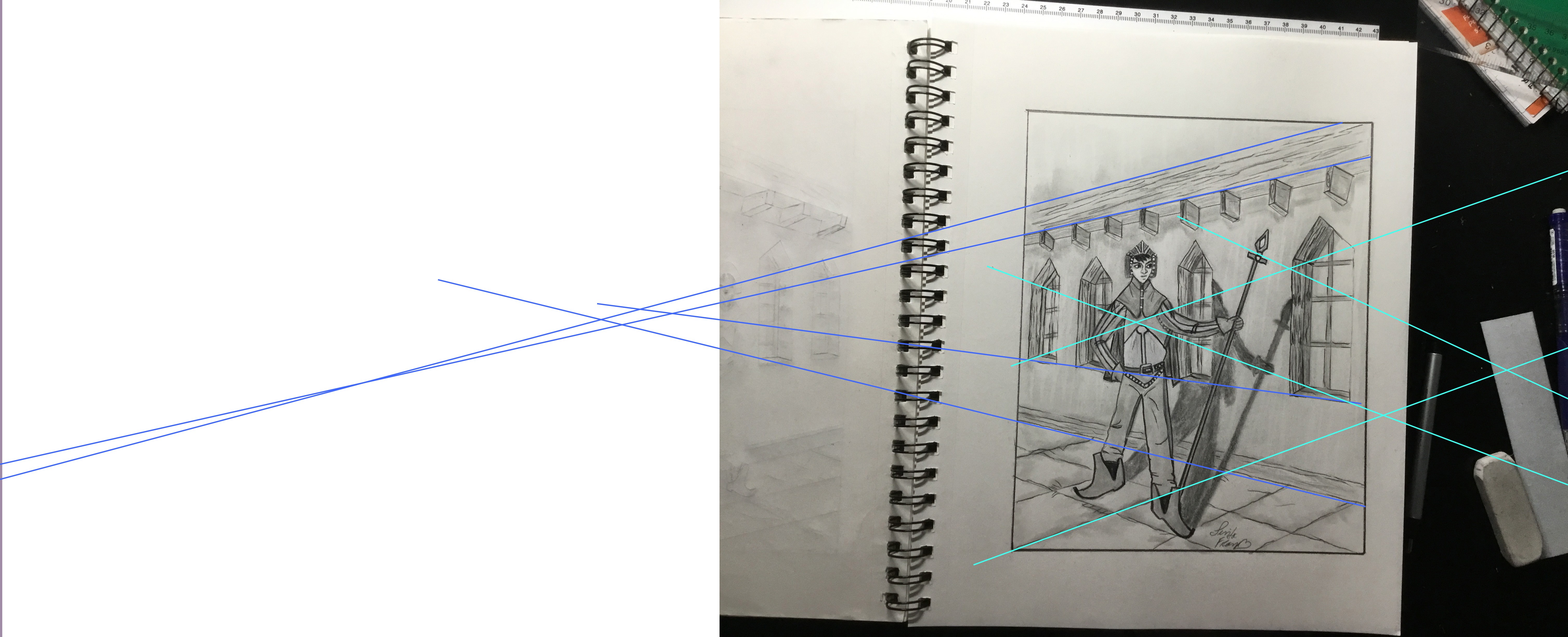 Je t'ai mis en bleu foncé les droites censées fuir vers le point de fuite 1 et en bleu clair celles censées fuir vers le point de fuite 2. Comme tu peux le voir, on dirait qu'il y a des points de fuite différentes presque pour chaque élément (pourquoi ?), ce qui fausse tout le décor.