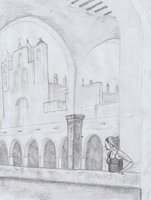 Par contre tu as un souci de perspective. J'ai mis un moment à comprendre. Tu as fait fuir la rambarde du premier plan vers le pont de fuite de gauche, qui est dédié aux faces orientées vers l'avant (l'avant du palais par exemple), donc a priori, la rambarde est parallèle à la face avant du palais, mais ça me semblait étrange à cause de la colonne tout à droite de l'image et de la position du personnage (physiquement impossible, tel que tu as dessiné les choses, la colonne est tout contre la rambarde, le perso ne peut donc pas se tenir comme il l'est actuellement.