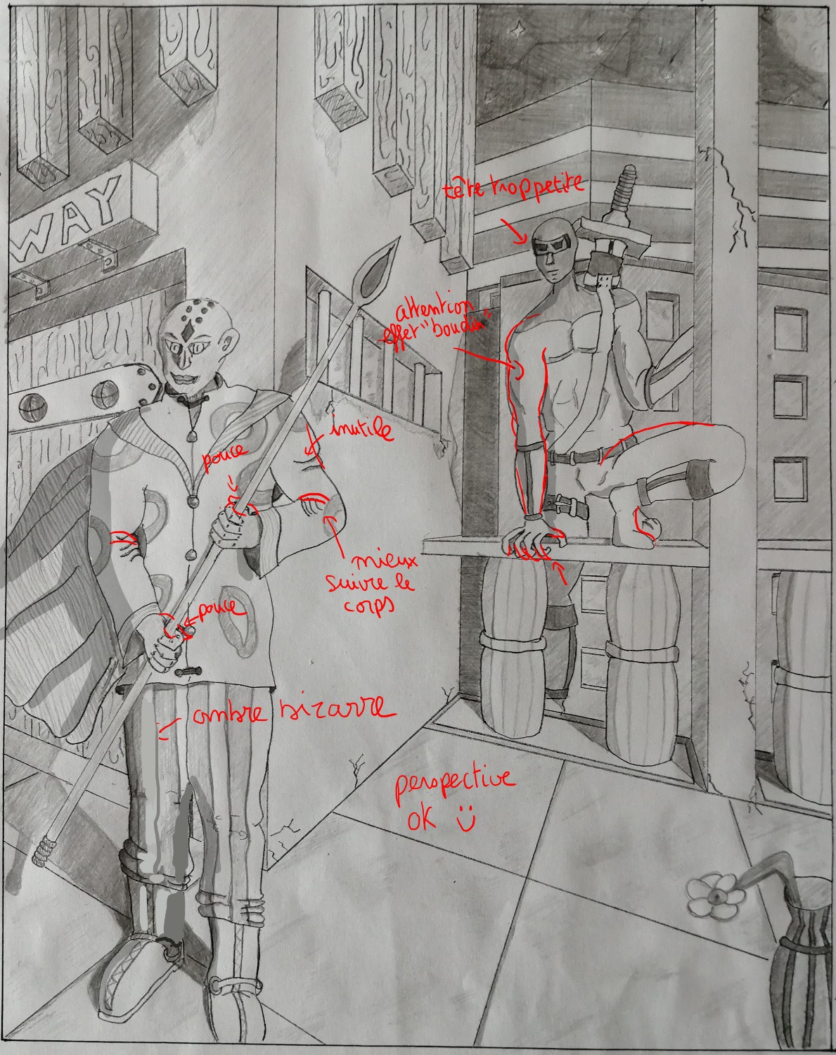 Ansonsten scheint mir die Perspektive erfolgreich zu sein, Bravo! Deine Charaktere sind gut in der Perspektive. Seien Sie nur vorsichtig für den vorderen Charakter, seine Füße sind in der Perspektive, aber nicht in seinen Schultern. Die Schulter rechts sollte daher niedriger sein. Es könnte funktionieren, indem es sagt, dass es diese Schulter erhebt, aber nicht sehr natürlich ist. Für die Charaktere sind sie ziemlich gut ausreichend Proportionen, haben aber ein wenig kleine Köpfe. Achten Sie auf die etwas "Wurst" -Formen bestimmter Muskeln, und was die Falten gut den Beugungspunkten des Körpers folgen. Ich habe Sie auch in Ihrem Zeichnen bestimmter Details korrigiert, insbesondere in den Händen. Der vordere Charakter scheint ein langes Hemd zu haben, aber wenn es die Länge seiner Büste wäre und nicht nur das Hemd, das überschreitet, wäre es im Vergleich zu den Beinen etwas lang. Ich habe Ihre Schatten auf Ihren Charakteren korrigiert, sie haben nicht viel davon, wenn das Lichtsinn dies zulässt. Auch der Schatten, der unter dem vorderen Charakter getragen wird, ist etwas seltsam, das ich finde. Im Allgemeinen leicht eine Schattenreichweite zu machen, die etwas ein wenig verwischt macht und das verblasst, während sie sich vom Charakter entfernen. Es macht ein natürlicheres Betrug ^^