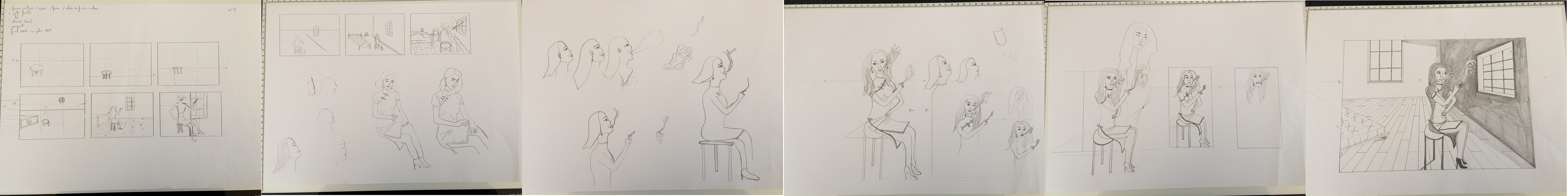 Schließlich wollte ich für den Charakter eindeutig etwas zu kompliziertes für mich tun. Das Gesicht ist von vorne, aber die Augen schauen beiseite des Körpers 3/4, weil der Kopf gedreht ist und die Beine im Profil sind. Ich weiß nicht, ob ich mich verstehe. Grundsätzlich sitzt sie, schaut aber auf den Leser, während sie vor ihrem Blick flieht ...