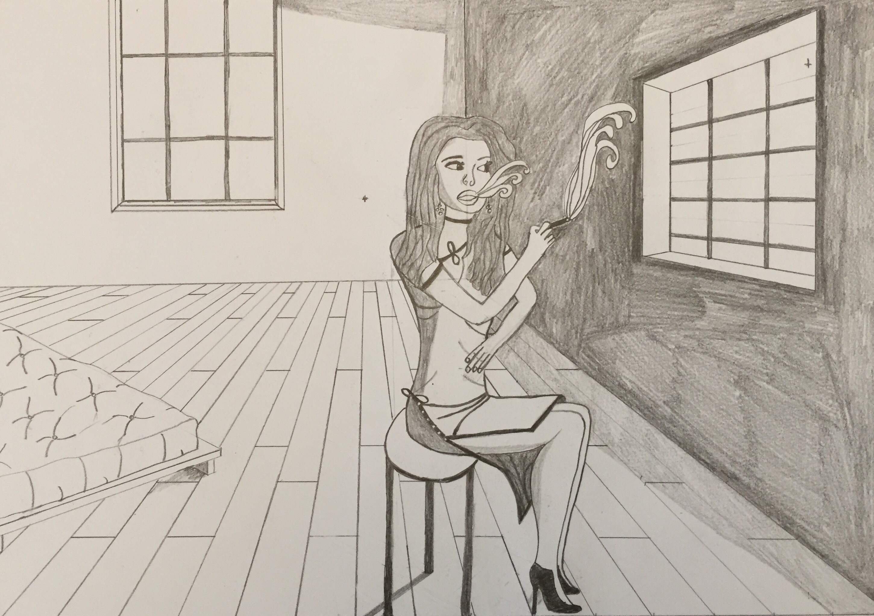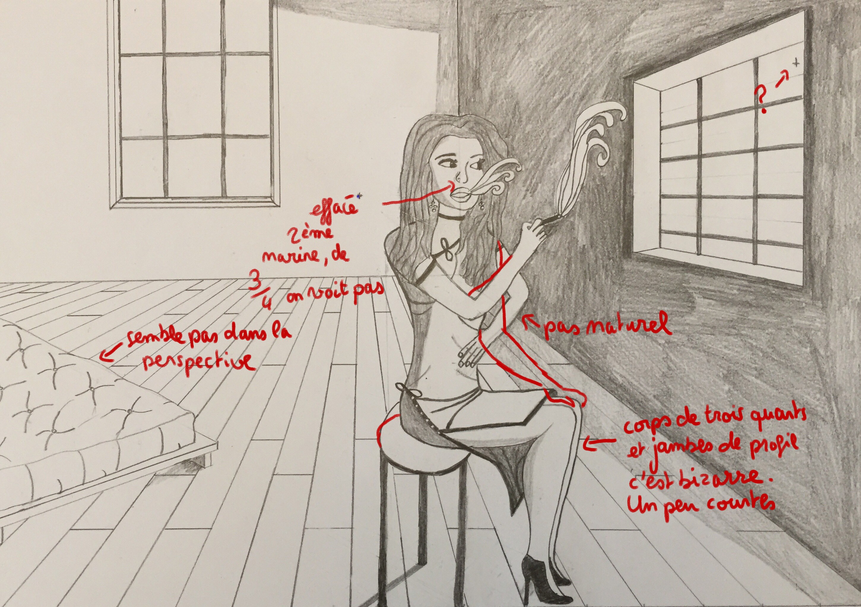 Le dessin est chouette, tu as utilisé plein d'éléments différents de la formation, c'est travaillé :) J'aurai tout de même quelques suggestions d'amélioration. Je te réponds à l'écrit mais aussi en annotations sur le dessin pour les éléments où c'est plus simple. La pièce pourrait effectivement être moins profonde, en plus la ligne du sol plus basse sur une ligne des tiers rendrait mieux niveau composition. D'ailleurs le placement du personnage n'est pas idéal. Je l'aurais bien vue sur la gauche au premier tiers de l'image. Son placement presque au centre ne la met pas en valeur, on regarderait presque le lit en premier, pas idéal pour le sens de lecture. Aussi le fait qu'elle s'arrête pile au bord de l'image en bas et que les pieds soient un peu coupés n'est pas très harmonieux. La perspective du lit me gêne, je ne pense pas qu'elle soit bonne. Il faudrait le faire avec 2 points de fuite, un à gauche qui sort de l'image et un à droite. Je vois un point en haut à droite de ta fenêtre droite. Qu'est ce que c'est ? Si c'est un point de fuite ce n'est pas bon, tous les points de fuite doivent être sur la ligne d'horizon (sauf exception d'un 3ème point de fuite possible en haut ou en bas pour la hauteur des objets mais la scène ne semble pas s'y prêter).