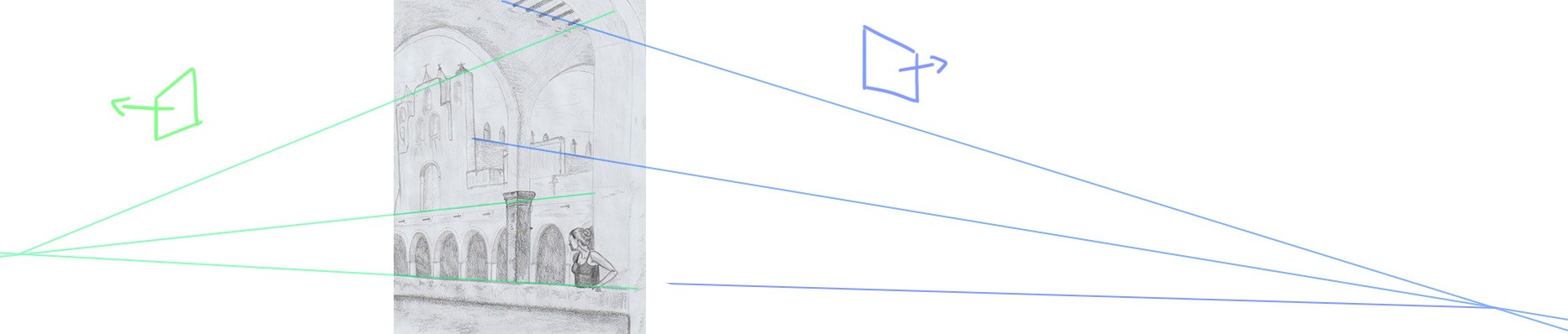 Außer, wenn Sie Ihre Linien in die falsche Richtung fliehen lassen und in Wirklichkeit das Geländer nicht parallel zur Vorderseite des Palastes, sondern parallel zum Rückseite des Palastes ist. In diesem Fall wird die Position des Charakters logisch. Aber plötzlich haben Sie den falschen Fluchtpunkt. Ich habe Ihnen ein kleines Diagramm gegeben, falls es nicht unbedingt sehr klar wäre. Für den Rest funktioniert es gut ^^