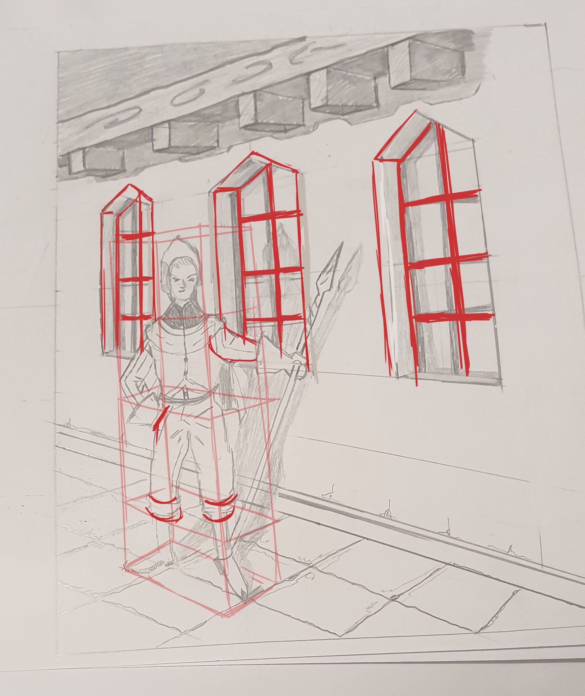 C'est pas mal ^^ Attention à la construction. Tes fenêtres ne font pas la même largeur, elles n'ont pas la même forme en haut non plus, l'espacement entre les poutres n'est pas le même non plus. Les barreaux des fenêtres ne suit pas du tout la perspective. Bref, des erreurs de construction. Prends bien ton temps pour poser tes bases, rappelle-toi aussi le cours de perspective où tu devais placer des fenêtres sur une façade. C'est la méthode que tu dois utiliser ici pour les poutres comme les fenêtres :3 J'ai fait une correction rapide à l’œil, c'est donc probablement pas tout à fait exact et je n'ai pas touché aux poutres comme tu peux le voir ^^