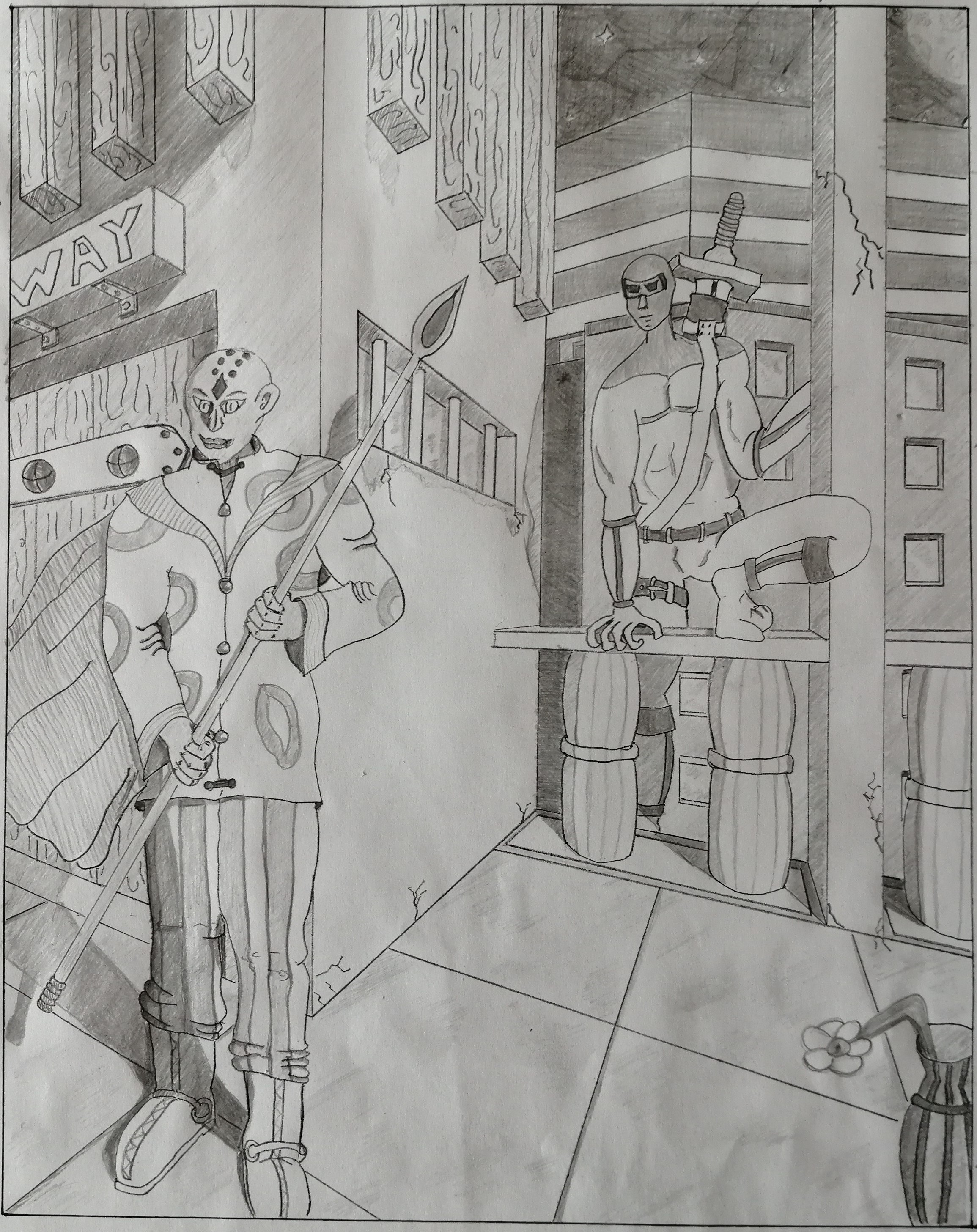 Es gibt einen guten Job in dieser Zeichnung! Sie wagen viele Elemente! Level Compo ist nicht schlecht, ich mag den Charakter von unten, um von der Stadt dahinter fast umrahmt zu werden. Ich hätte den vorderen Charakter einfach rechts nach rechts gelegt, um von einer dritten Partylinie gut gekreuzt zu werden (siehe dritte Herrschaftsregel) und dass die Seite rechts von seinem Körper weniger auf derselben Linie ist als die der Mauer dahinter. Ich hätte gerne das Teil links von der Vorderwand mehr verdunkeln, um den Charakter vorne herauszubringen, aber die Sorge ist, dass es nicht der Lichtrichtung entsprechen würde, die Sie ausgewählt haben. Plötzlich, um die Pläne besser zu unterscheiden, hätte ich mich von den Werten der Linien mit dickeren Merkmalen auf dem, was vor dem Vorkommen liegt, weniger auf dem, was dahinter steckt, oder zumindest die Silhouette des Charakters von vorne betont. Vielleicht würden die Gebäude im Hintergrund mehr ausbleiben, auch die Pläne besser zu trennen.