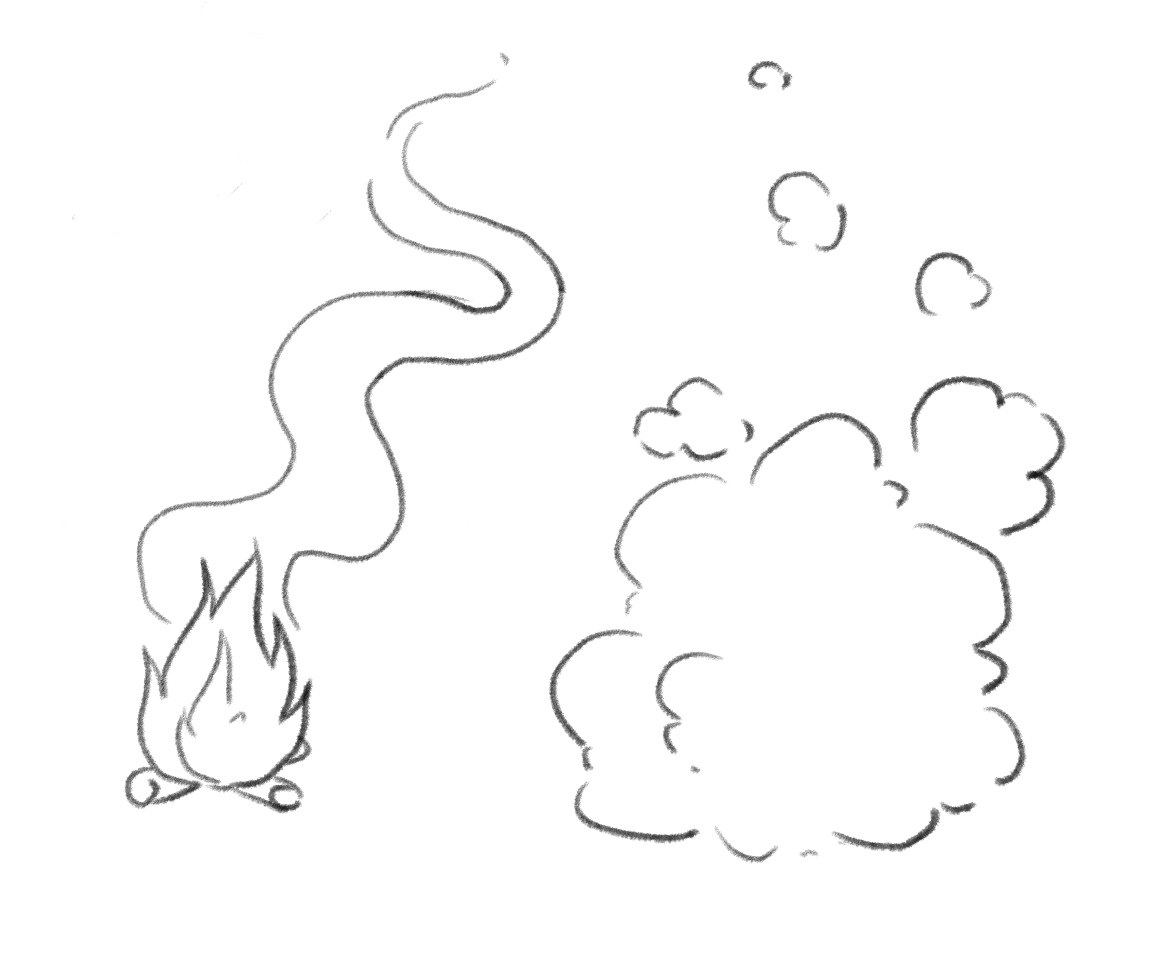 C'est sur les mangas, mais le principe est le même en réalité en moins exagéré. Bien regarder d'où partent les mèches de cheveux pour un mouvement cohérent, et procéder par mèches (ça créé des volumes qui structurent la coupe). Pour ce qui est de la fumée j'ai l'habitude de faire des volutes souples pour une petite fumée qui part au vent. Pour de la fumée plus "explosive" ça aura plus un aspect de nuage avec des petits bouts qui s'envolent. Je te fais un petit dessin exemple, mais ce n'est que ma manière de styliser.