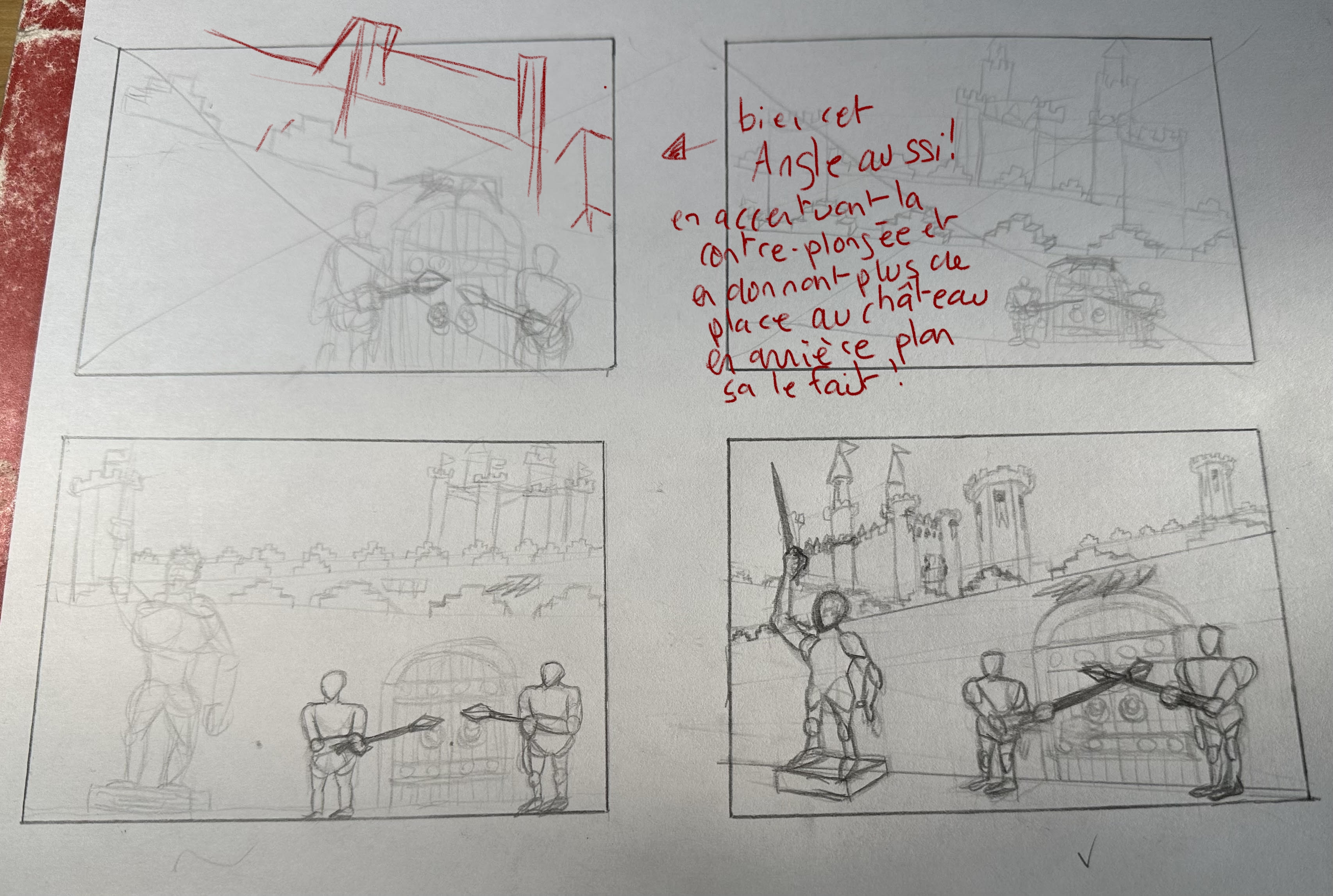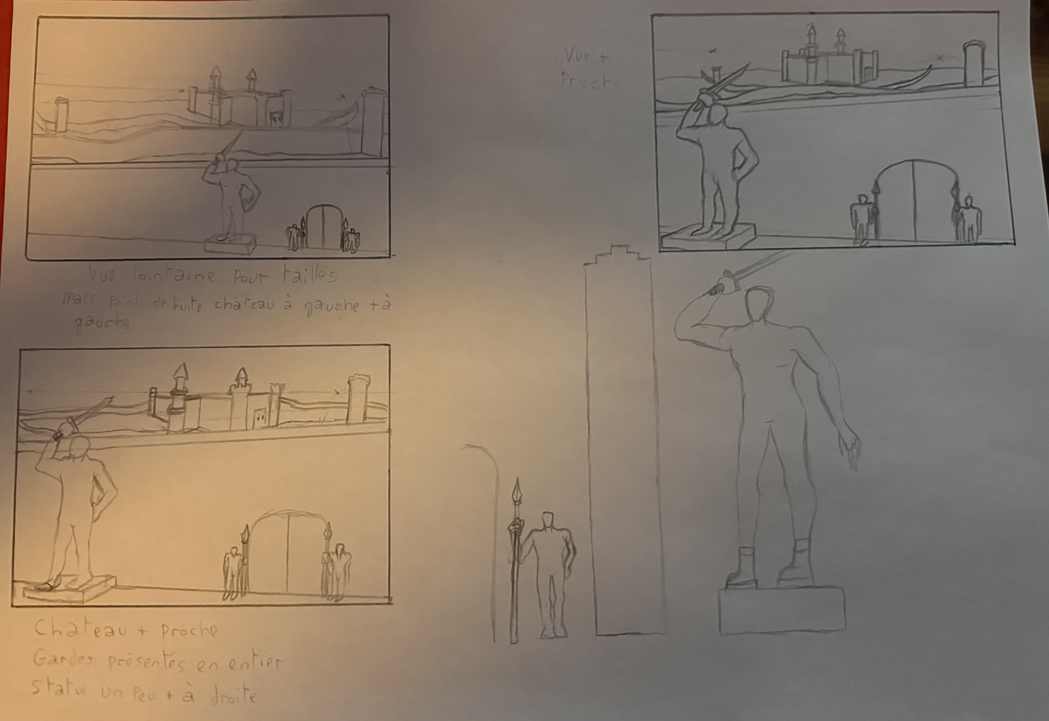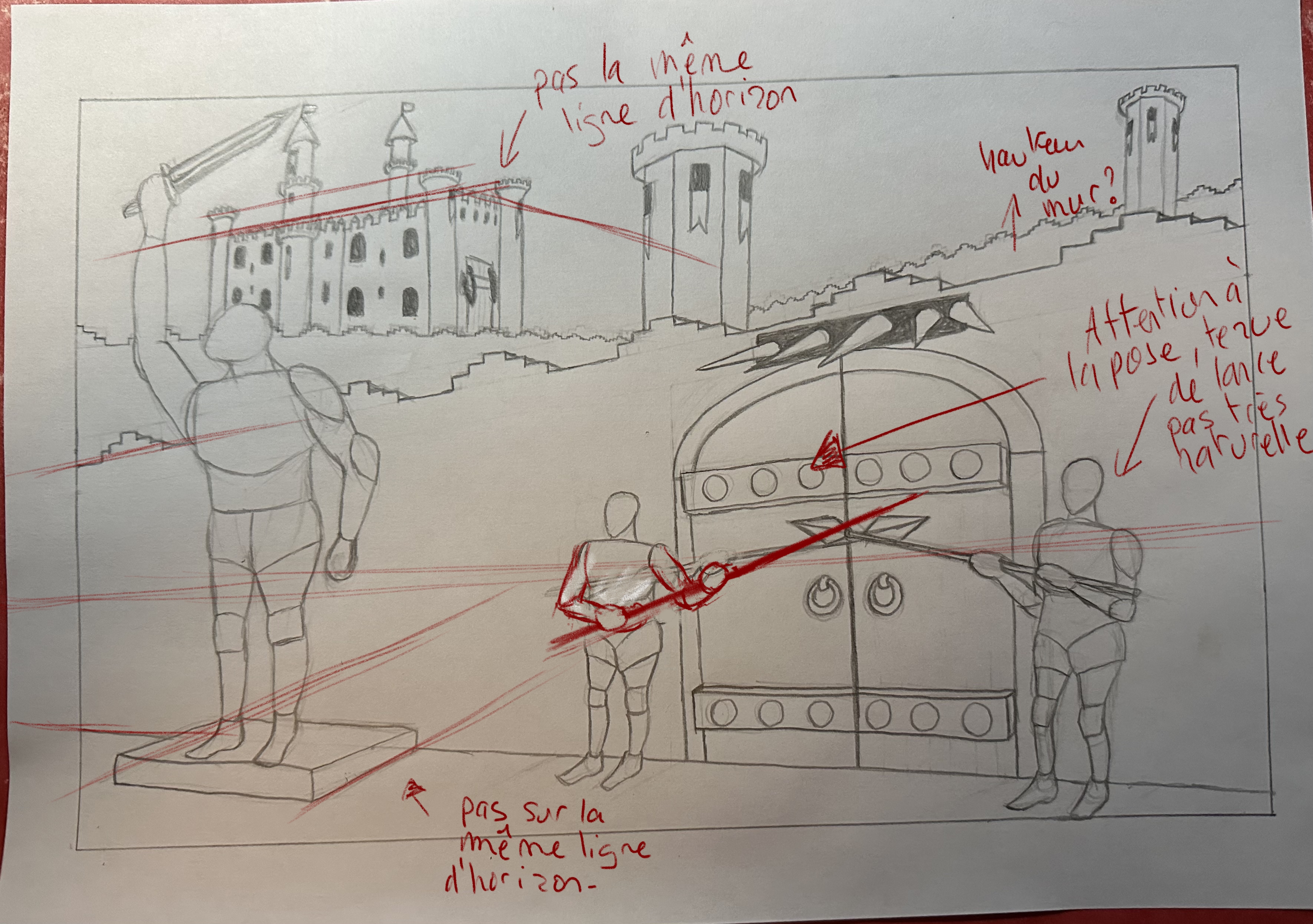 Um meine Kommentare fortzusetzen, denke ich, dass die Akzentuierung des Sichtwinkels (ein fettlicher oder konterwinkerer Ansicht) den großen Aspekt des Dekors (Schloss, Statue, Wand) mehr Auswirkungen hat. Außerdem denke ich, dass die Elemente zu Beginn des Bleistifts nicht so gigantisch erscheinen und den Einfluss verlieren. Bei meiner Korrektur beziehe ich mich auch auf die Höhe der Mauer, aber es ist für die Statue und das Schloss im Hintergrund dasselbe. Tatsächlich komme ich zu dem Schluss, dass es Ihre Wachen sind, die in dieser Umgebung zu groß sind! Sie können sie leicht in zwei Hälften und noch mehr verschieben, und Sie werden sehen, dass das Dekor mehr an Größe gewinnen wird!