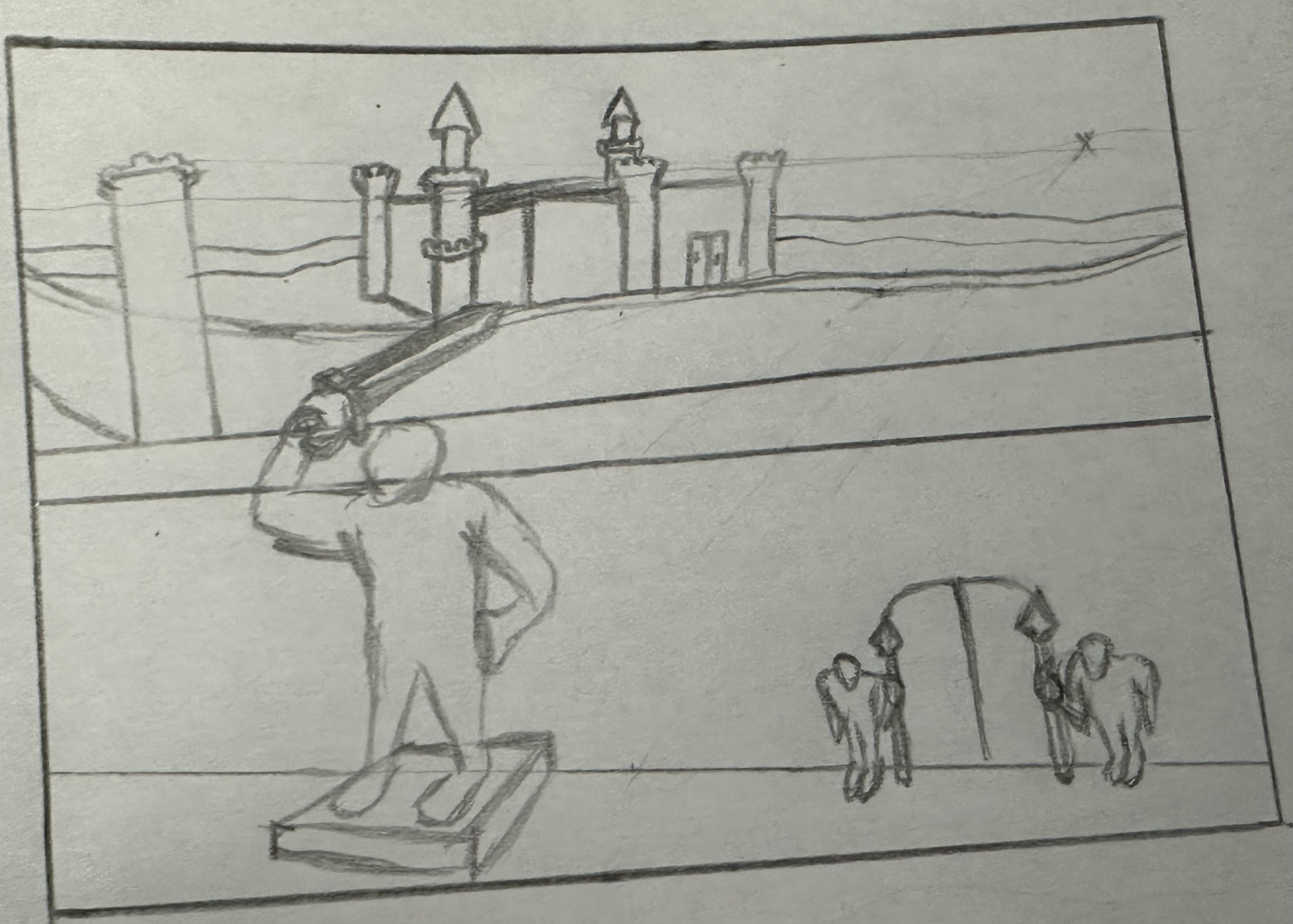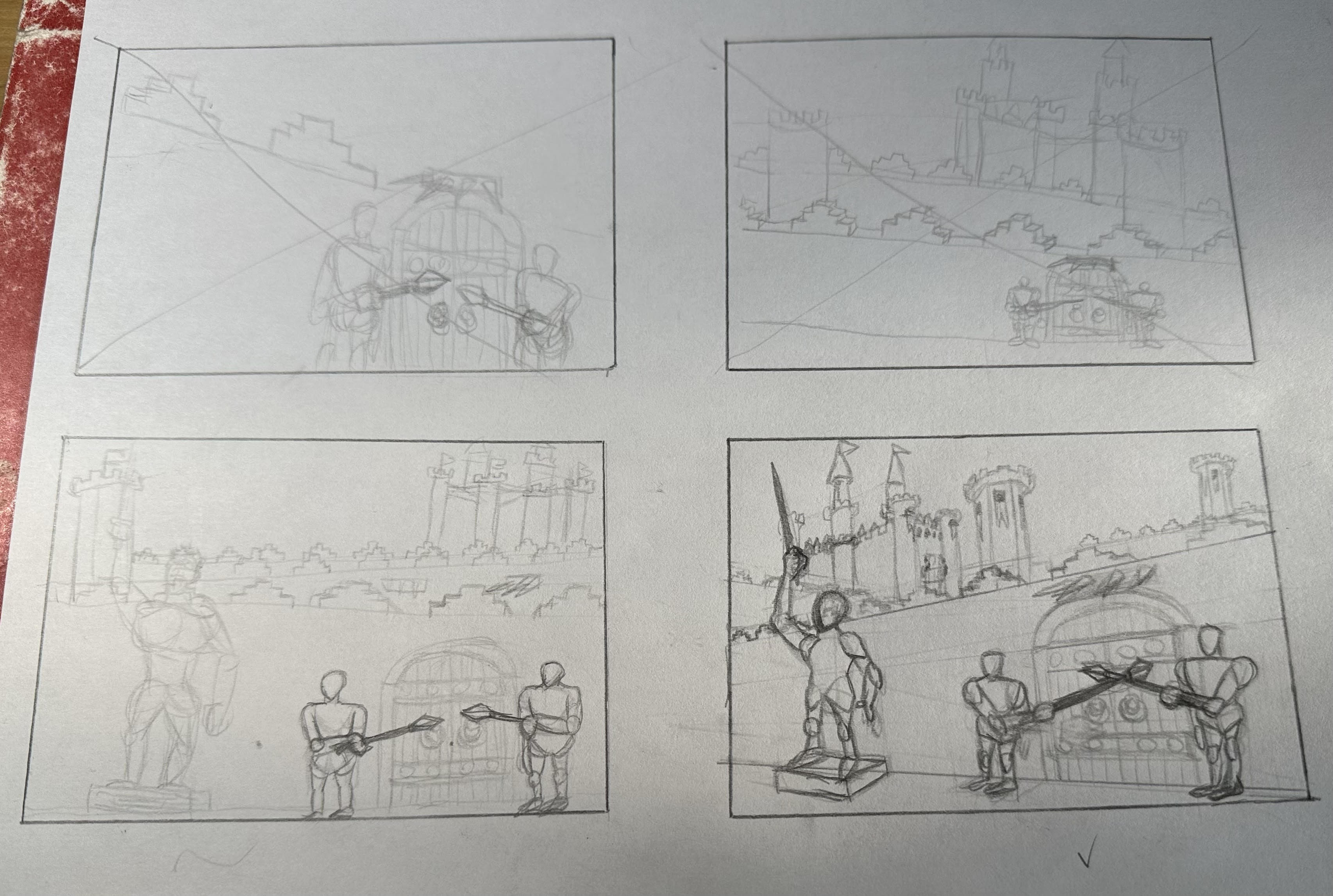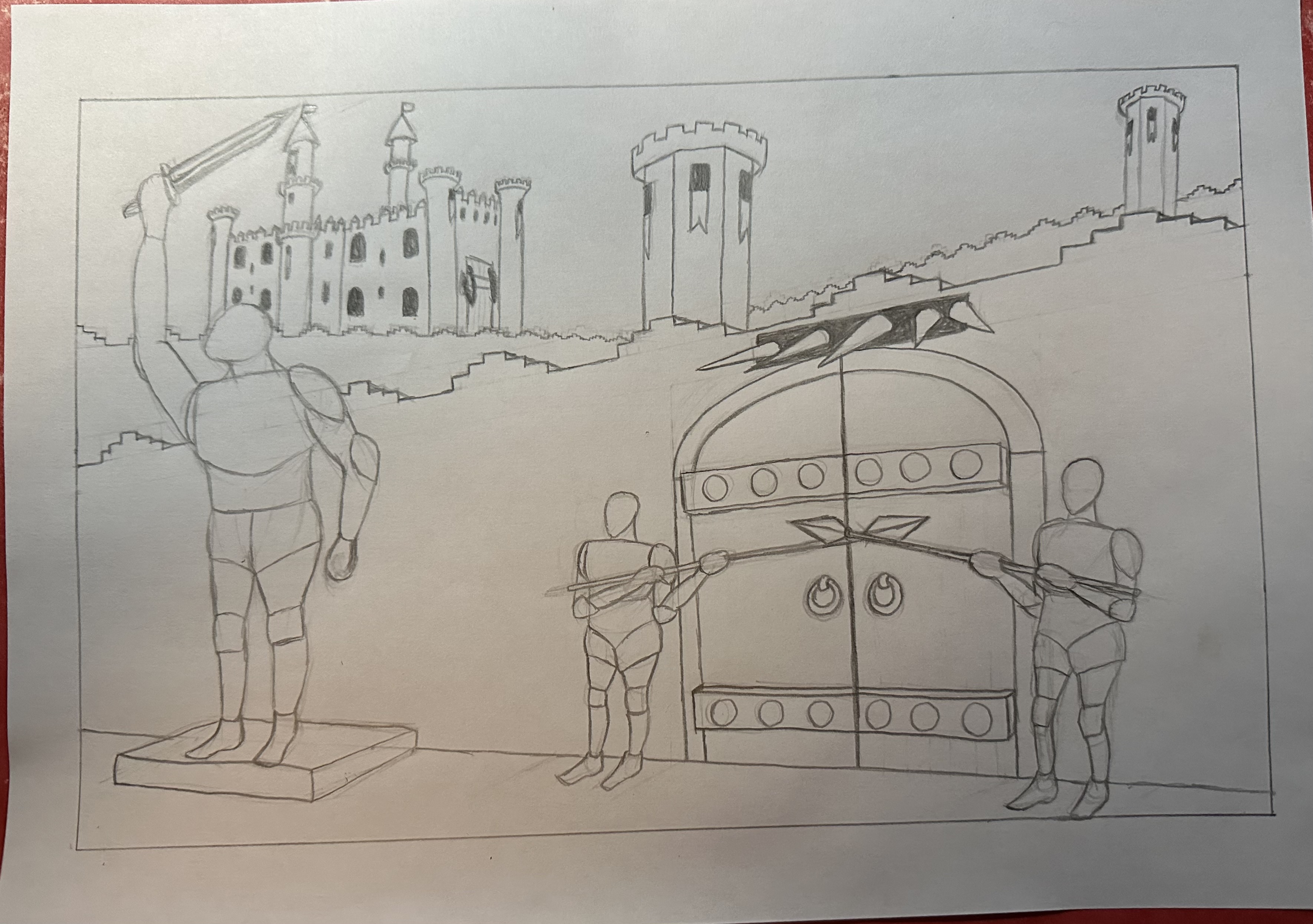 J'ai envie de réaliser un dessin avec un portail dans un muraille gardé par deux gardes et une statue imposante d'un chevalier pas loin au premier plan avec d'autres murailles, quelques tours et un chateau plus en arrière-plan