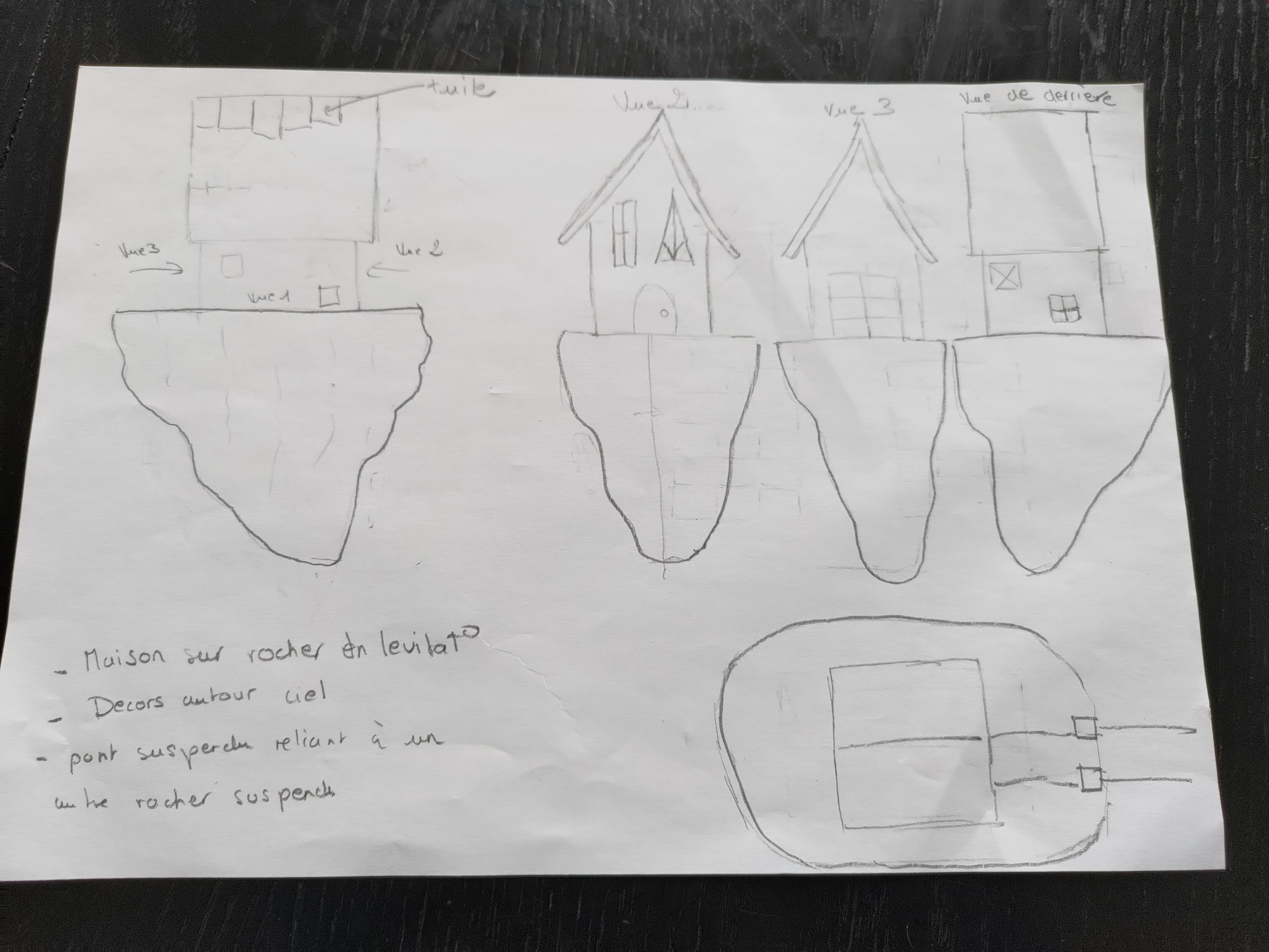 Je souhaite réaliser une illustration d'une maison sur un rocher flottant dans le ciel avec un pont suspendu relié a un autre rocher flottant toujours dans le ciel.
