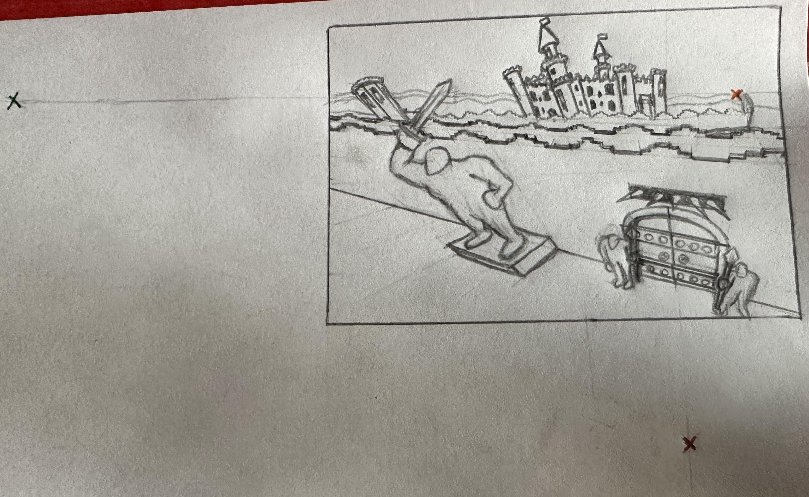 Par contre, Ton premier plan est en plongée, et l'angle du château en arrière-plan est en contre-plongée, il y a un souci... C'est une composition assez complexe, mais déjà si tu souhaites faire une vue en plongée ta ligne d'horizon doit être plus haute! Le château devrait être lui aussi en dessous de la ligne d'horizon.