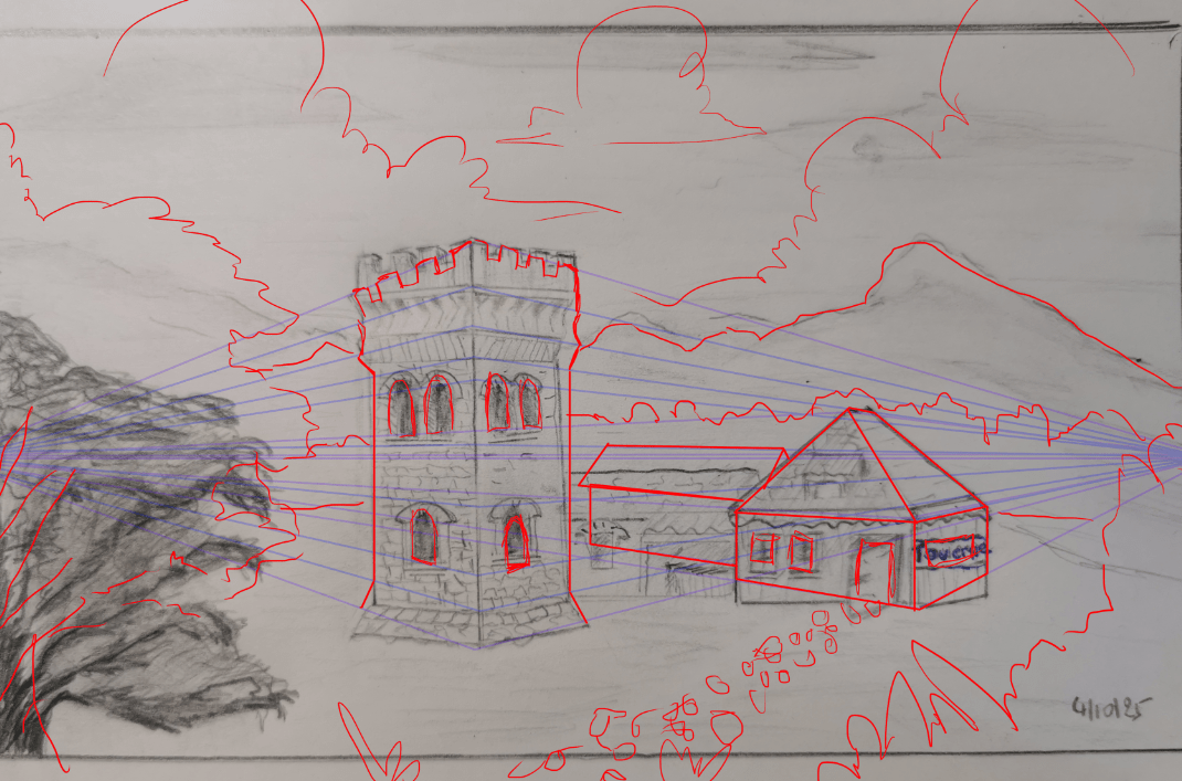 J'adore cette composition médiévale ! Le travail sur les textures est très minutieux, c'est excellent ! Concernant les corrections : cet arbre que tu as placé sur le côté est très précieux. Je le ferais un peu plus grand et je ne le laisserais pas seul. Tu pourrais dessiner quelques arbustes de l'autre côté pour équilibrer l'image. Tu verras aussi que j'ai ajouté une forêt derrière tes édifices : cela donnera un horizon très clair et riche. Je te recommande également d'ajouter des nuages imposants pour lui donner une touche épique. Du côté de la perspective, j'ai projeté les points de fuite. Voici les ajustements à prendre en compte pour obtenir une plus grande précision. Pour ce qui est des tons et des gris, si tu le souhaites, tu peux ajuster cela en premier. Mais avant toute chose, définis bien d'où provient la lumière du soleil.
