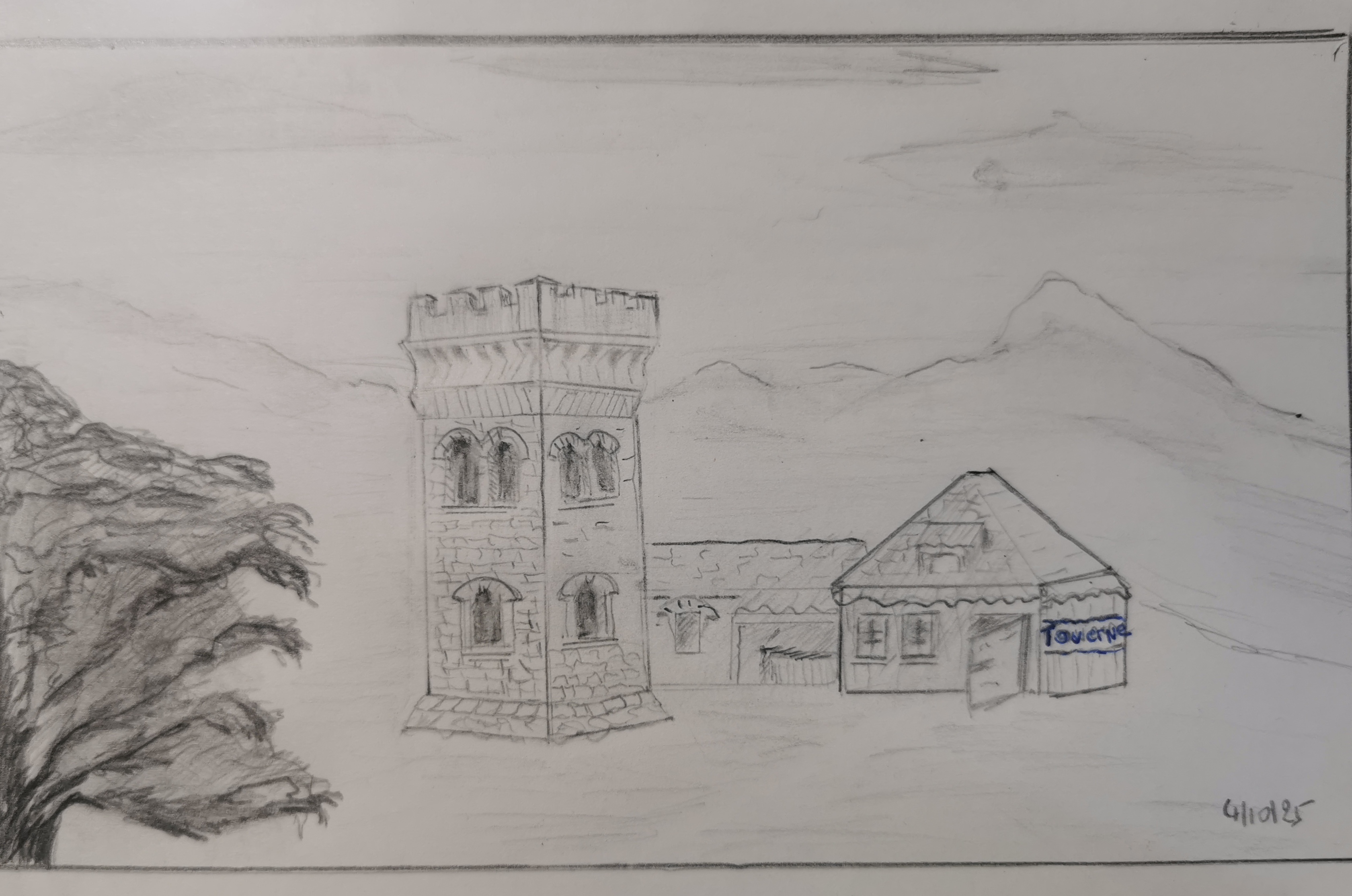 Concernant les corrections : cet arbre que tu as placé sur le côté est très précieux. Je le ferais un peu plus grand et je ne le laisserais pas seul. Tu pourrais dessiner quelques arbustes de l'autre côté pour équilibrer l'image. Tu verras aussi que j'ai ajouté une forêt derrière tes édifices : cela donnera un horizon très clair et riche. Je te recommande également d'ajouter des nuages imposants pour lui donner une touche épique.