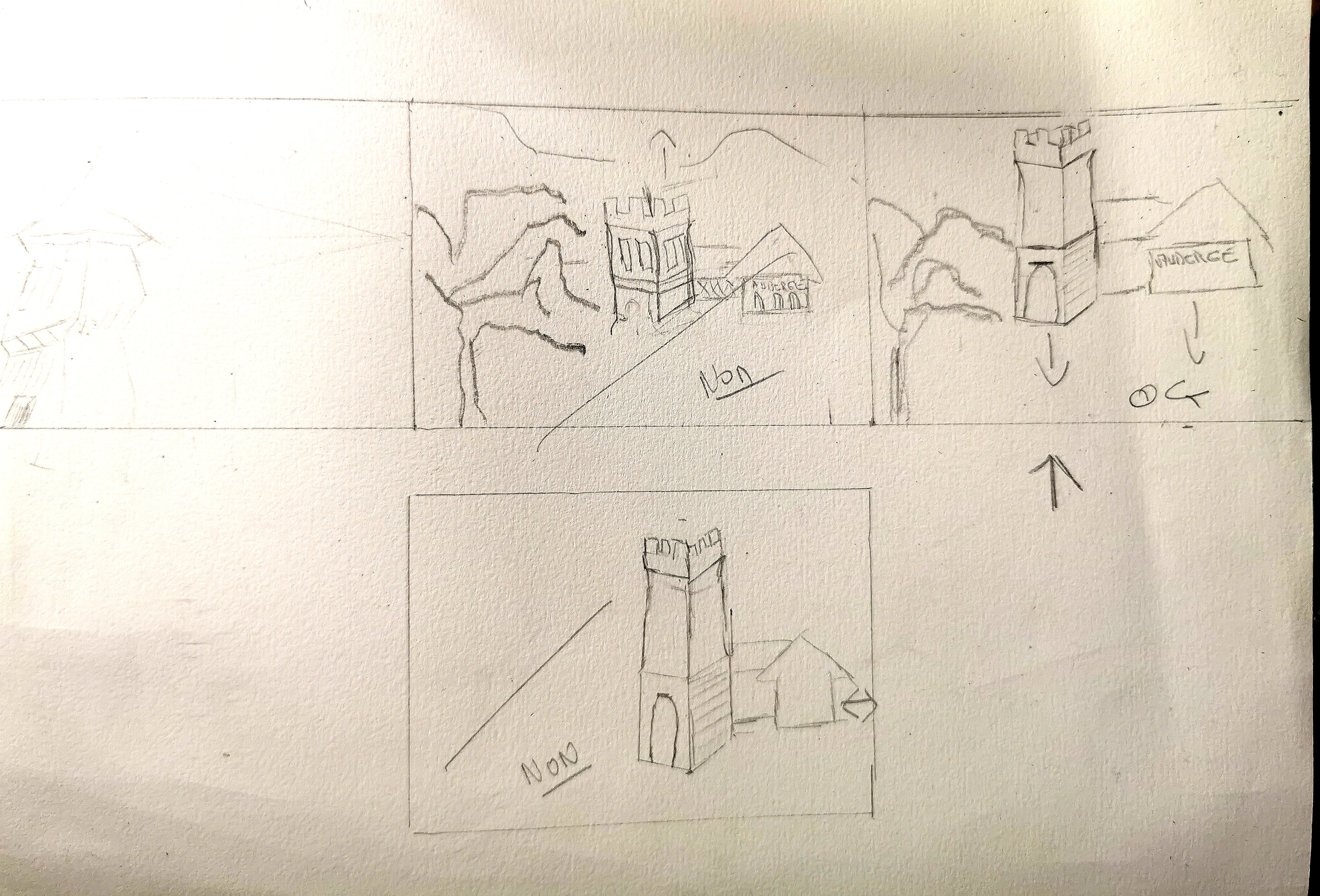 Ich liebe diese mittelalterliche Komposition! Die Arbeit an den Texturen ist sehr sorgfältig, sie ist ausgezeichnet! Was die Korrekturen betrifft: Dieser Baum, den Sie zur Seite gestellt haben, ist sehr wertvoll. Ich würde ihn etwas größer machen und ihn nicht alleine lassen. Um das Bild auszugleichen, könnten Sie auf der anderen Seite einige Sträucher zeichnen. Sie werden auch sehen, dass ich hinter Ihren Gebäuden einen Wald hinzugefügt habe: Dadurch entsteht ein sehr klarer und reicher Horizont. Ich empfehle außerdem, hoch aufragende Wolken hinzuzufügen, um dem Ganzen eine epische Note zu verleihen. Auf der perspektivischen Seite habe ich die Fluchtpunkte projiziert. Hier sind die Anpassungen, die Sie berücksichtigen müssen, um eine höhere Präzision zu erreichen. Was Töne und Grautöne betrifft, können Sie diese bei Bedarf zunächst anpassen. Aber zunächst müssen wir klar definieren, woher das Sonnenlicht kommt.