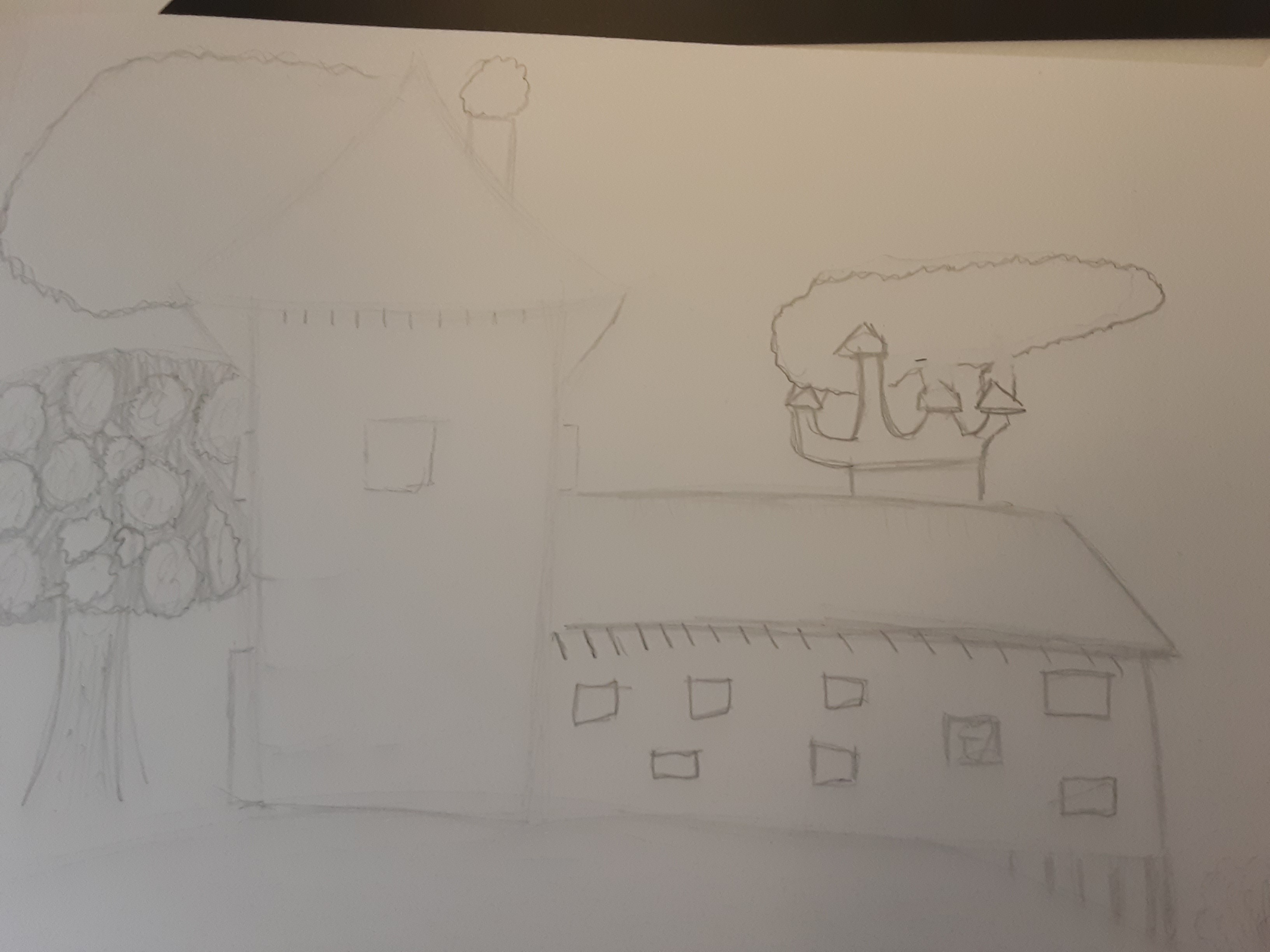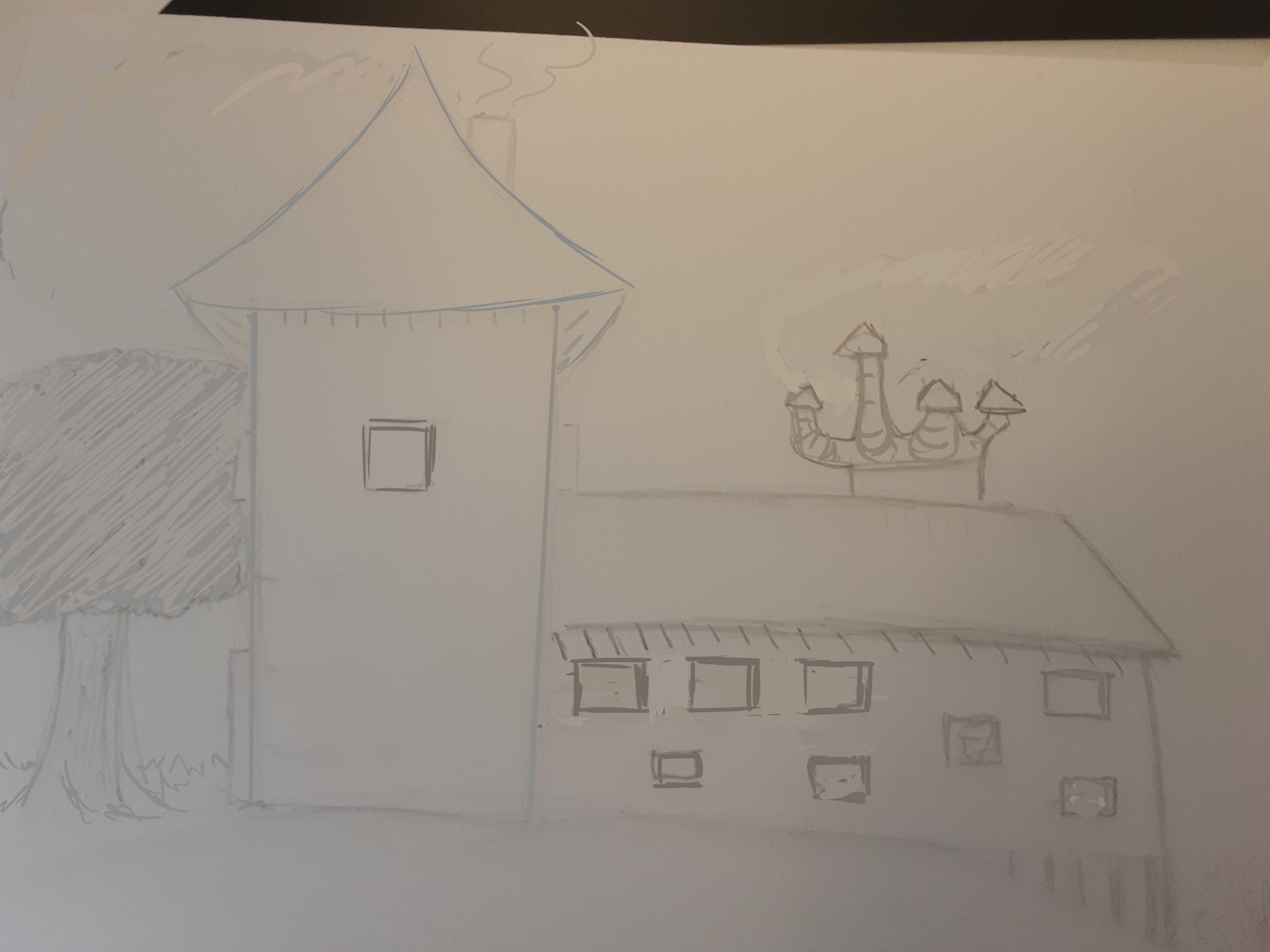 Il y a une bonne base, mais son sent que tu fais attention et que tu travailles bien certains éléments comme la tour de la maison et le toit, et que tu expédies d'autres éléments : les fenêtres, les cheminées, l'arbre et les nuages. N'hésite pas à prendre des références, sers-toi de tout ce que tu as vu jusqu'ici. Tu connais les règles de perspective, elles s'appliquent à tout. Ici tes fenêtres ne sont pas droites, elles ne sont même pas alignées à vrai dire et elles ont des tailles très variables.