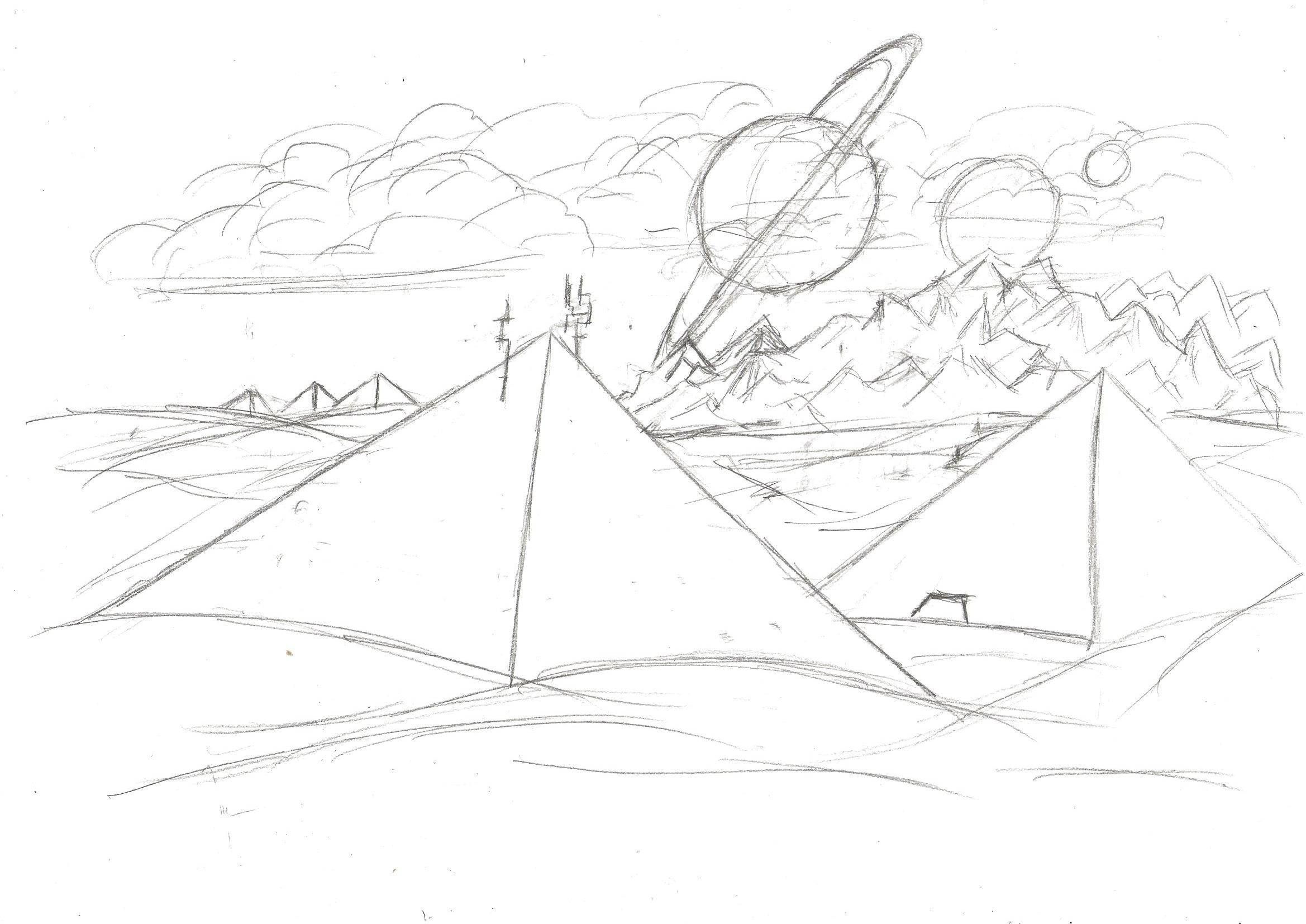 J'ai juste l'impression que tes pyramides sont inclinées vers la droite, mais sinon ça fonctionne plutôt bien. N'hésite pas à jouer sur les valeurs de traits pour détacher tes plans les uns des autres. Je pense à l'arrière-plan avec les montagne (?) qui est trop présent et brouille la lecture de l'image.