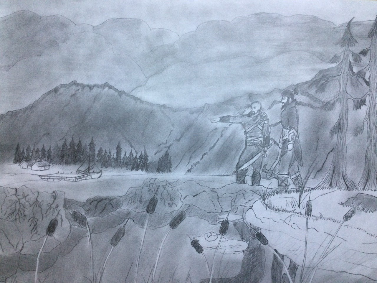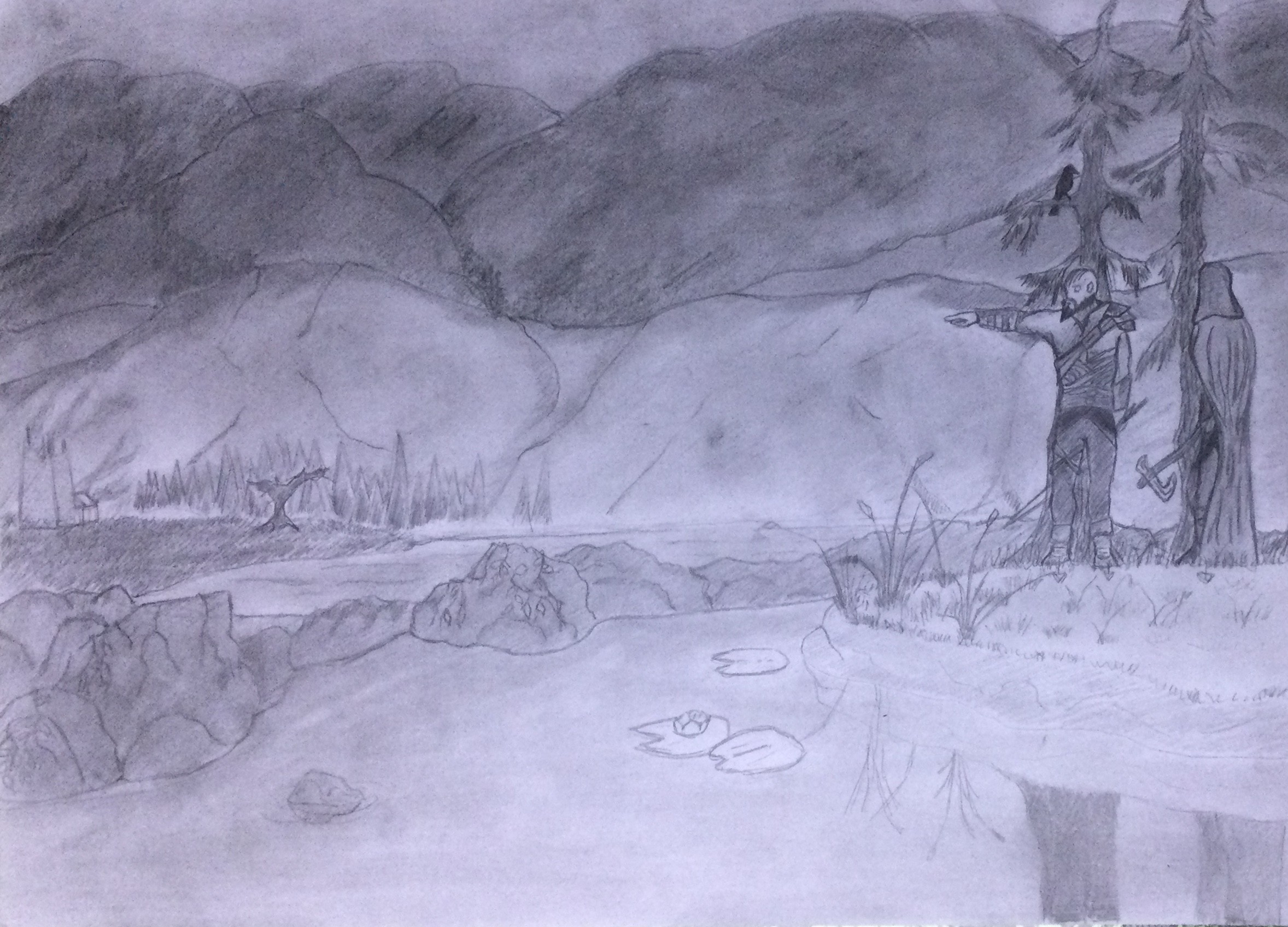 - Tu as un souci de valeurs de gris, tes personnages se détachent mal des arbres qui eux même se détachent mal des montagnes en arrière plan. Peut-être accentuer certains contours/zones sur les personnages aiderait, ainsi qu'adoucir un peu les montagnes (légèrement plus claires)