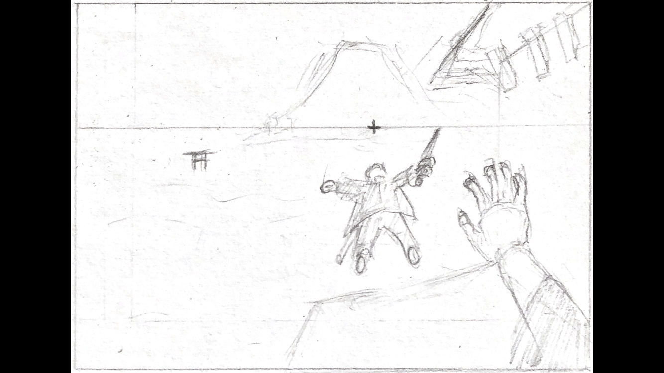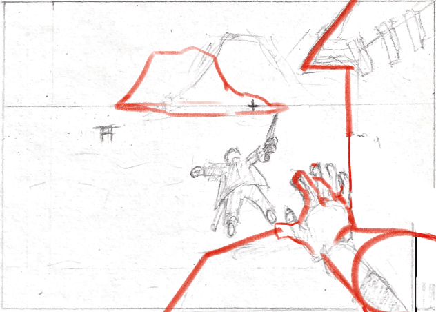 Bonjour, nouvelle pochade avec les mêmes éléments agencé différemment. Cette fois ci le même château que la dernière fois pour la perspective, avec en premier plan une personne sur un toit ( premier plan) tentant de retenir une autre sautant dans le vide ( second plan ) et la mer ( ligne d’horizon ) à gauche et une sorte d’île en arrière plan.