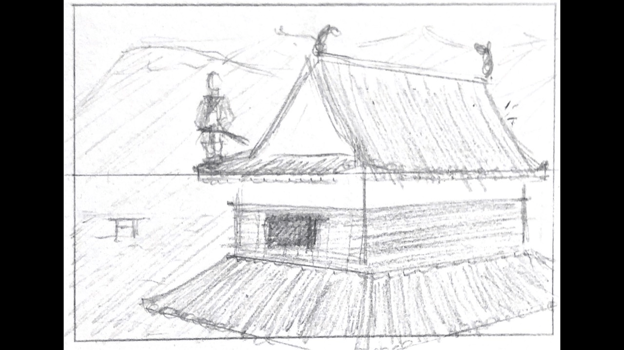 Je suis parti après quelques recherches sur un château japonais asser contrasté en premier plan. Un homme avec un sabre sur le toit et un paysage de montagne et de lac en arrière plan
