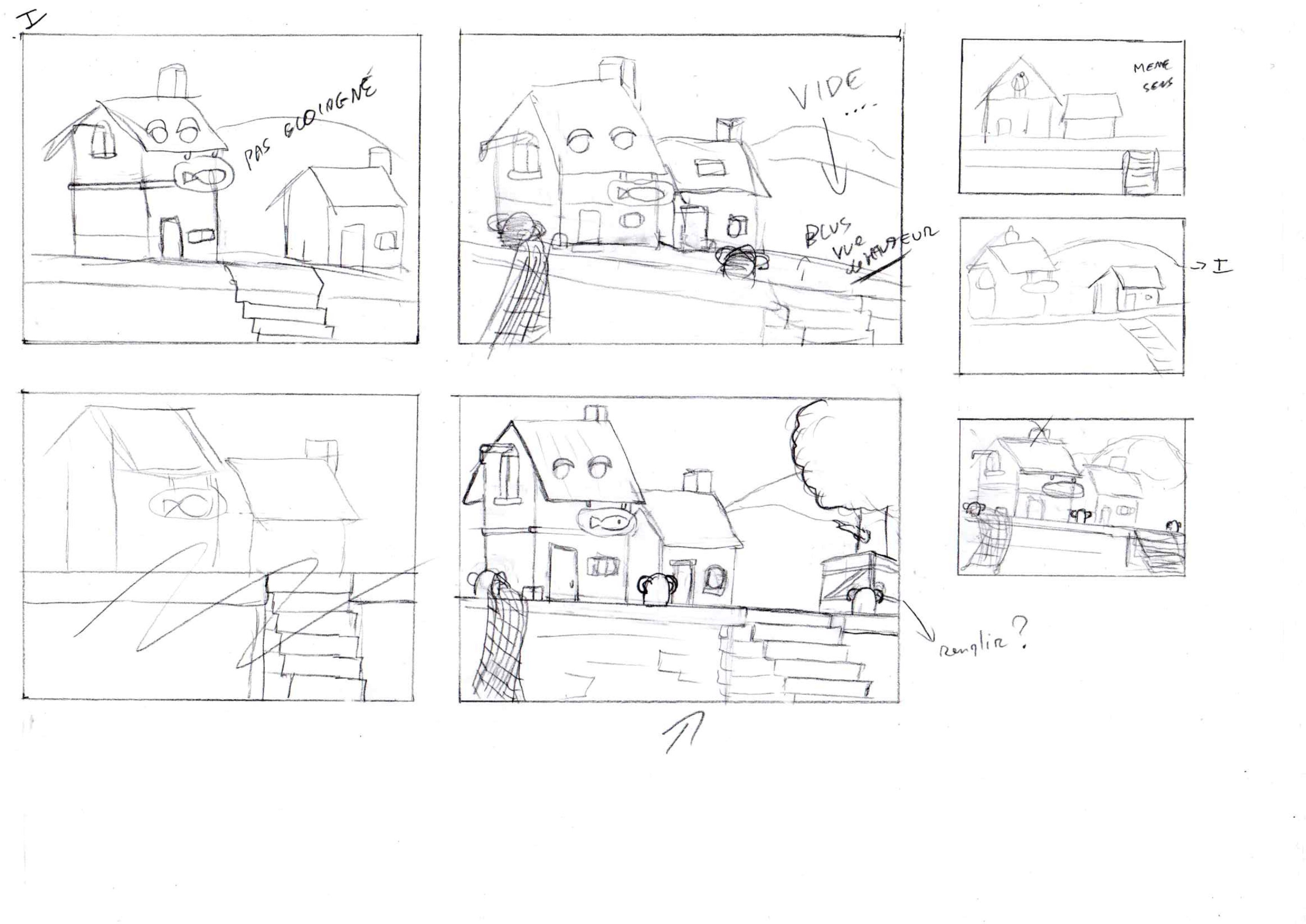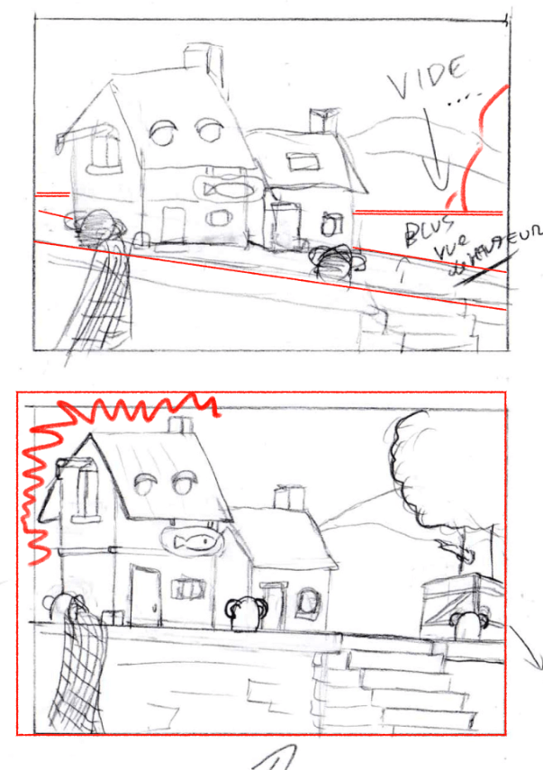 Pour l'autre dans la vue plus frontale, elle fonctionne bien aussi mais j'aurais laissé un peu plus d'espace autour de la grande maison, là elle est un peu coincée dans le cadre je trouve. Autrement le reste de l'image fonctionne bien :) Ca peut être une bonne idée de partir sur cette compo là si tu ne veux pas trop t'arracher les cheveux avec la perspective.
