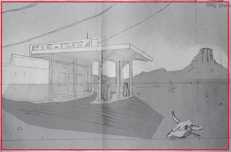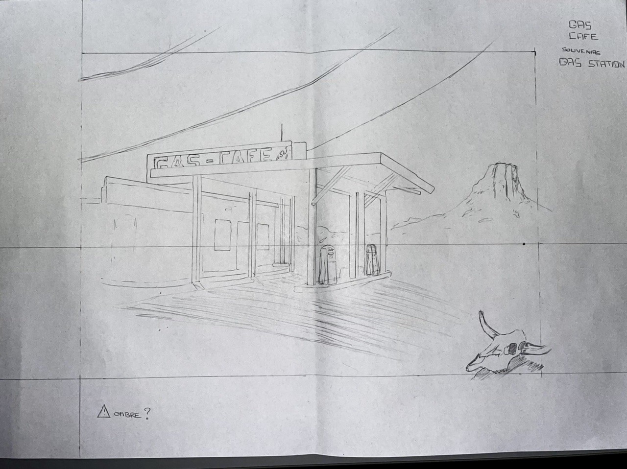 Que pensez-vous de ce travail pour l’instant ? Je peux poursuivre dans cette direction ou avez-vous des conseils ? Je suis pas convaincu que le crâne soit à sa place près d’une station même abandonnée... Je pensais intégrer un ou deux cactus plutôt en arrière plan également.