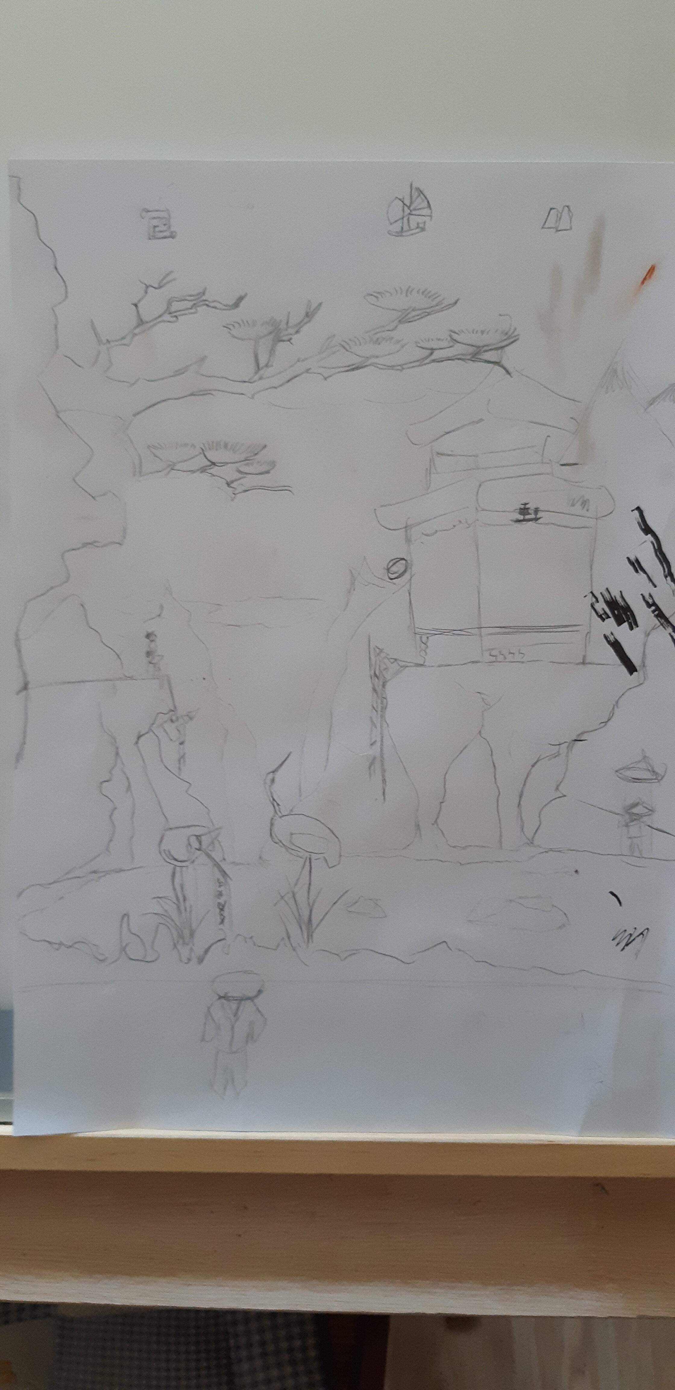 Le thème imposé par ma fille " temple Japonais" vaste sujets et les impératifs de la formation, donc je suis parti j'avais en tête cela. Une petite recherche pour ne pas faire du hors sujet et voici mon brouillon.