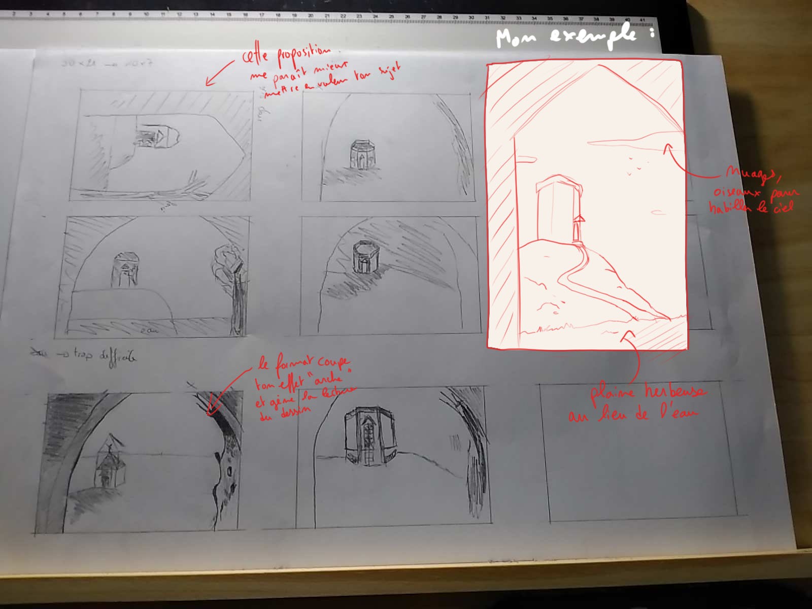 Tout d'abord concernant la méthode, attention à ne pas tout vouloir placer à l'avance et se dire qu'on ne change que l'angle en choisissant la composition. Il ne faut pas se bloquer et bouger les éléments dans le cadre pour avoir quelque chose de bien. Ce n'est pas un problème si tu as besoin de placer les éléments de dessus pour visualiser, mais il ne faut pas se bloquer là dessus.
