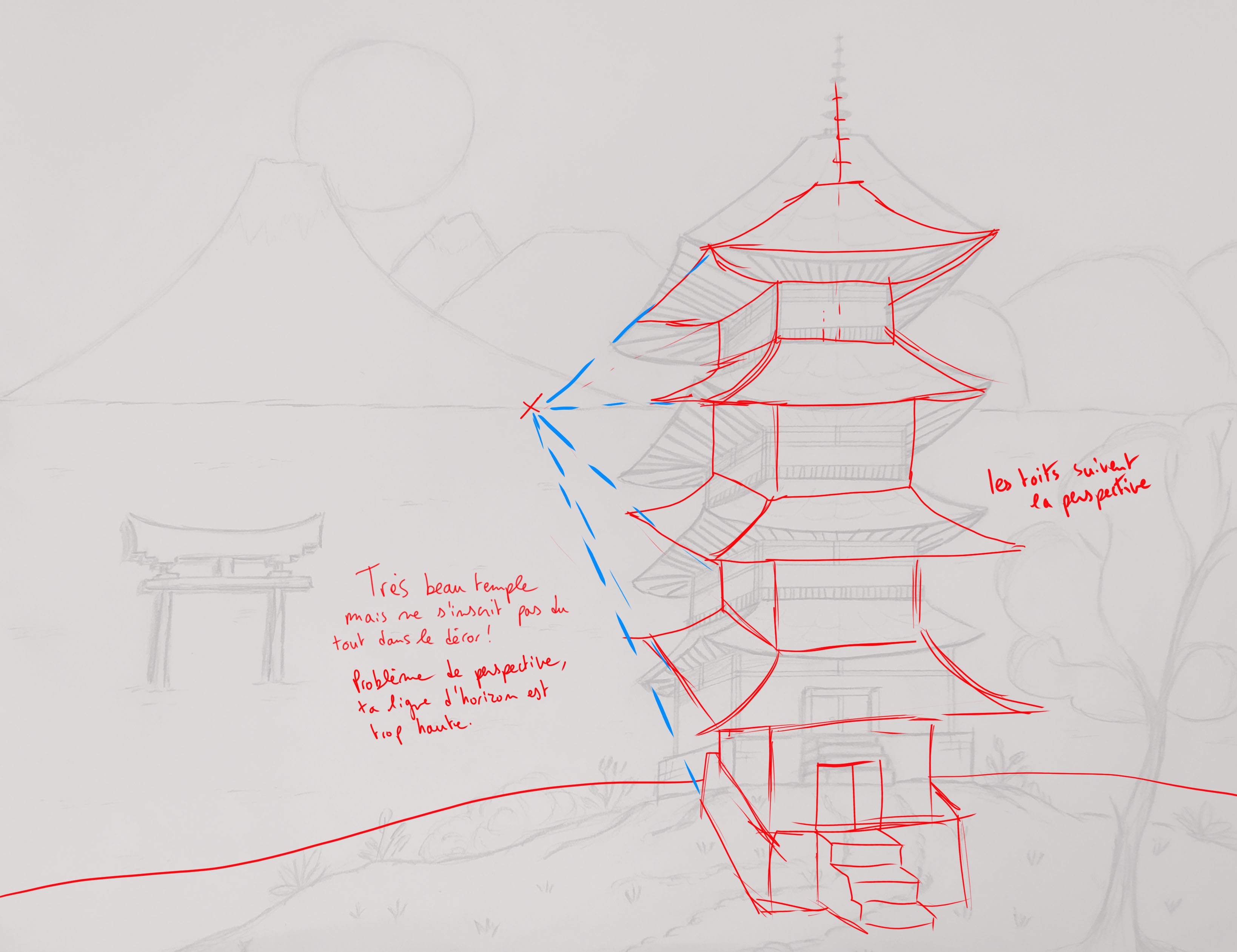 Mais même avec ça, la perspective du temple n'est pas tout a fait juste, mais c'était un sujet difficile. La prochaine fois, essaie vraiment de commencer par schématiser avec des formes simples, cubes, lignes et d'être sûr que ta perspective est juste avant d'attaquer tes détails 😉