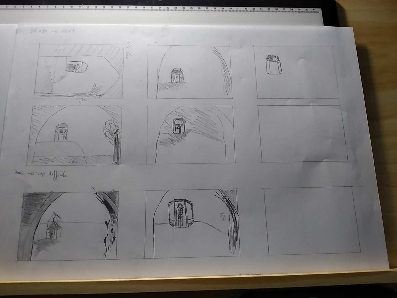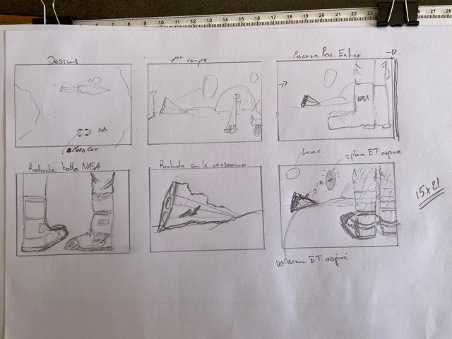 Das erste Rechteck ist ein Blick über Ich sagte mir, dass es mir helfen würde, im Weltraum zu sein. Der zweite (von G bis D und H in B) ist eine erste Komposition, die dritte ist eine weitere Komposition mit einem Sichtwinkel, den ich bevorzuge. Unten links ist es eine Suche auf Astronautenstiefeln (im Netz zu sehen). In der Mitte am Boden eine Studie über das zerstörte Schiff. Der letzte ist die Komposition, wo sie ist.