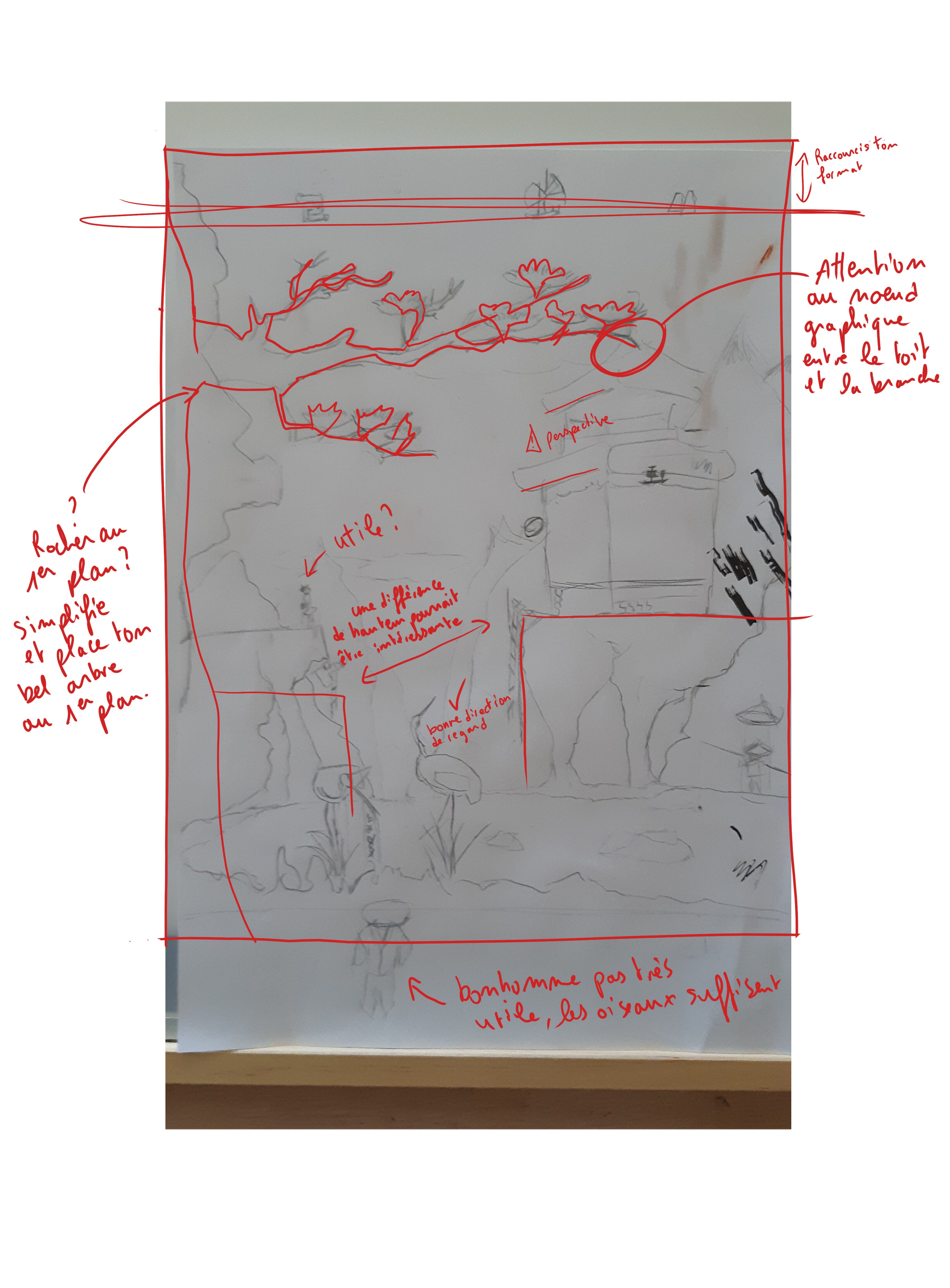Je compte mettre de la couleur sur le dessin final, sûrement aux crayons et/ou feutres. Peut-être une version NB car j’aime beaucoup ce style et ce dessin pourrait peut-être bien s’y prêter.